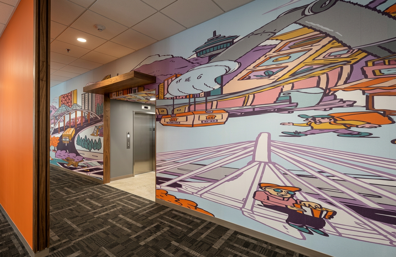 keep mural exactly as shown grey door in hallway is an elevator wrap mural onto ceiling near elevator leave other ceiling as is lighten tiles down elevator hallway