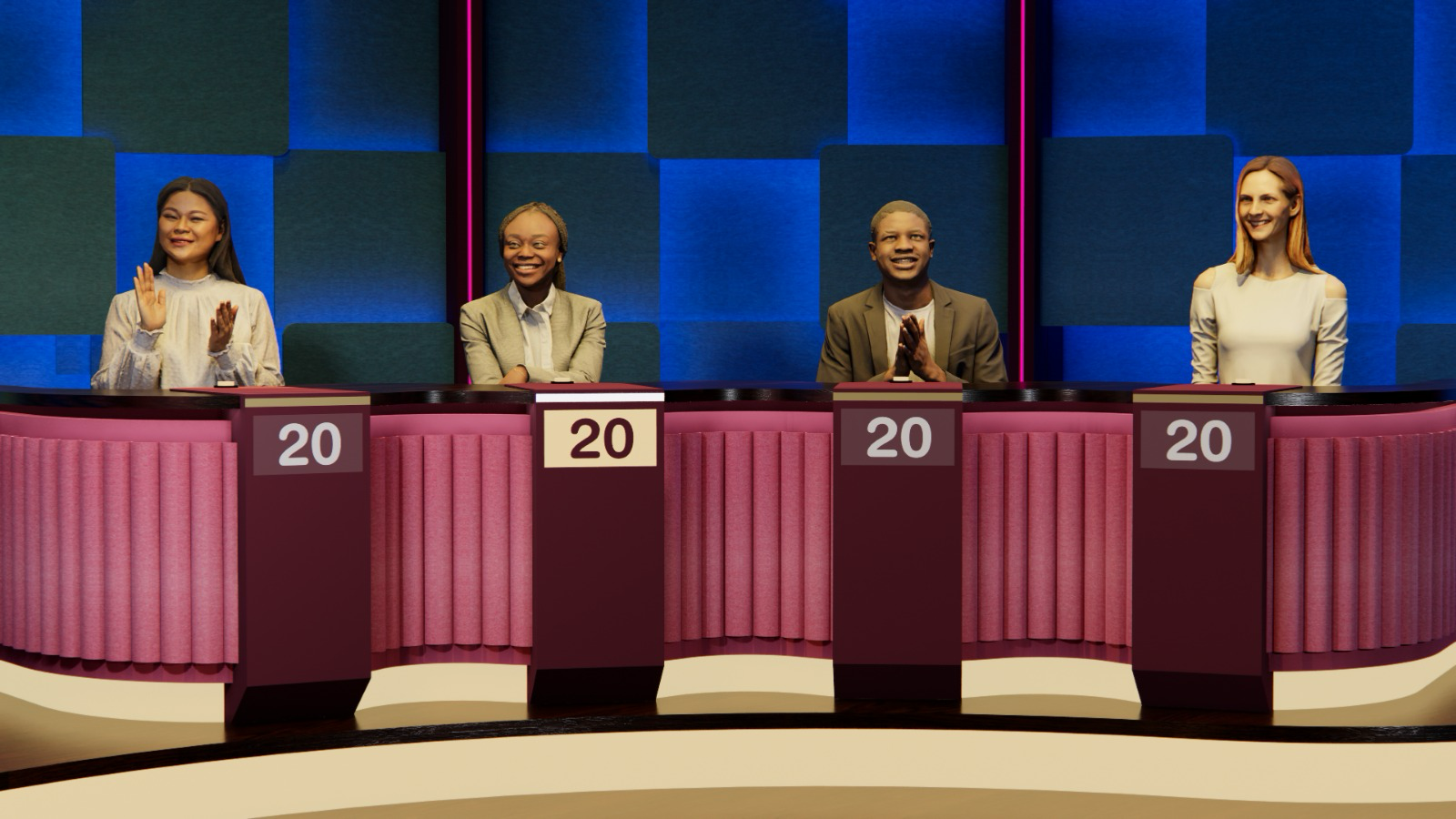 a medium wide eye level photorealistic rendering of a dynamic four panel game show set four diverse contestants replicating the poses and appearances left to right an asian woman in a textured white blouse clapping a black woman in a grey blazer with a broad smile a black man in a brown blazer with a bright smile and a white woman in a cream cold shoulder top smiling are seated behind a large continuous curved desk the desk features vertical fluted pink magenta felt panels and a dark curved wooden top surface integrated within the desk are four dark maroon colored square displays each clearly showing the illuminated white number 20 the background is composed of a complex grid of large overlapping felt textured geometric panels in alternating deep teal and royal blue hues these panels are dramatically framed and backlit by intense glowing magenta pink led neon light strips which reflect richly on the felt surfaces and create a deeply saturated high energy almost hyper vibrant color palette across the entire scene vertical led light tubes rise between the felt panels the lighting is direct and dynamic like professional tv studio production lighting the foreground floor is a clean slightly glossy light off white curve the visual style is crisp with visible textures on fabrics felt and wood all under powerful colorful lighting the camera is steady offering a clear view of all contestants and desk elements