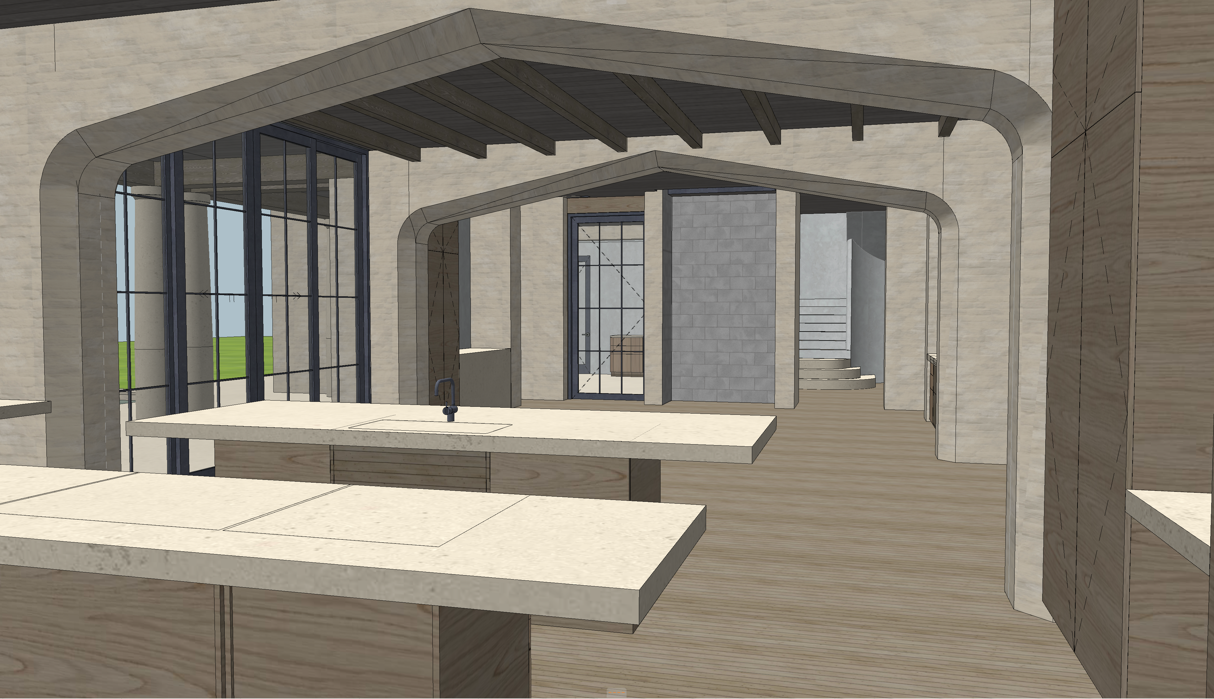 wide plank wood floors tan lime washed brick marble countertops white oak cabinets white oak ceiling reclaimed wood beams on ceiling