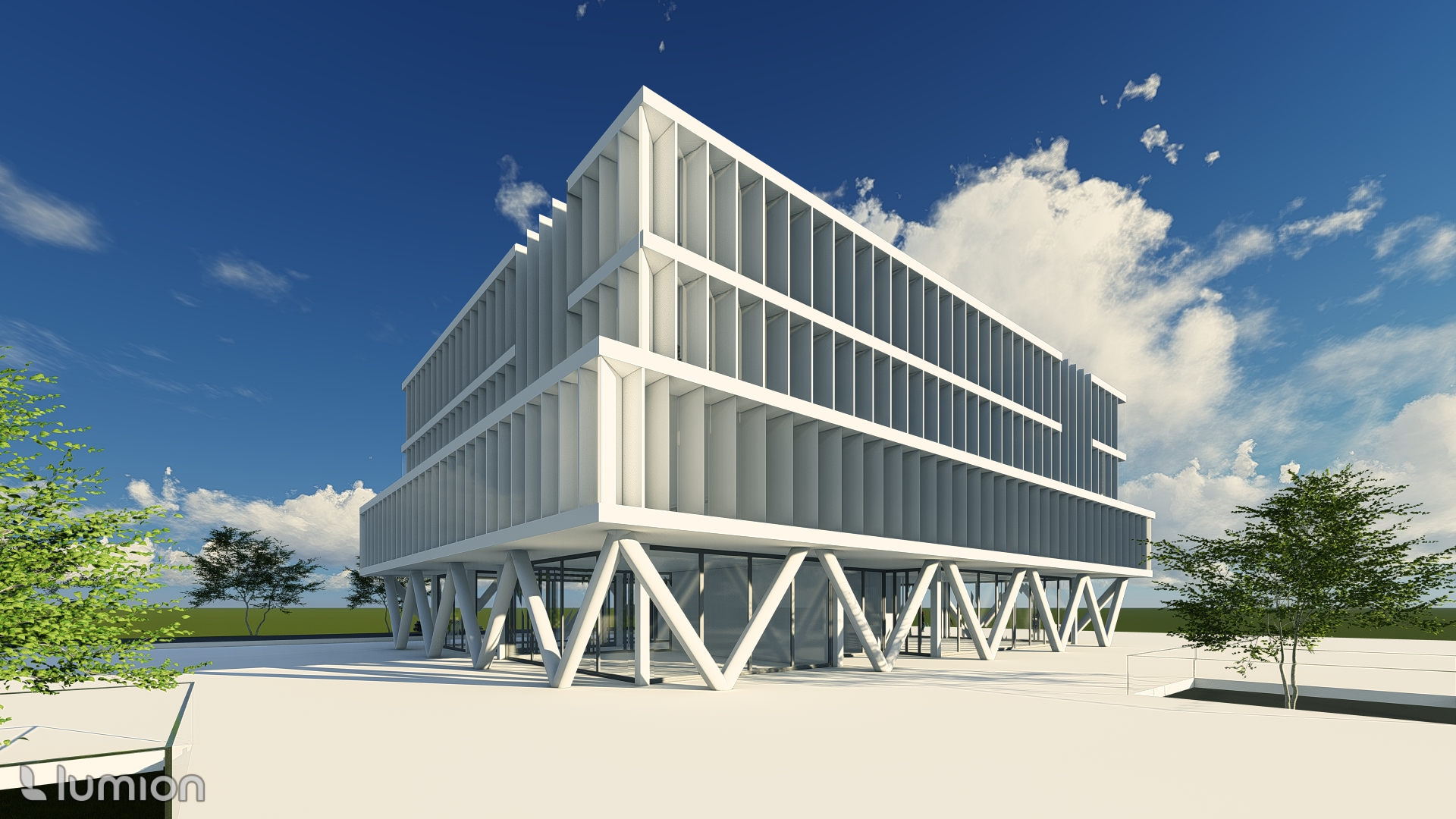 change the image to a night scene add lighting the trees should be subtly illuminated from below with a spotlight the office spaces should appear somewhat bright and welcoming but not too overpowering