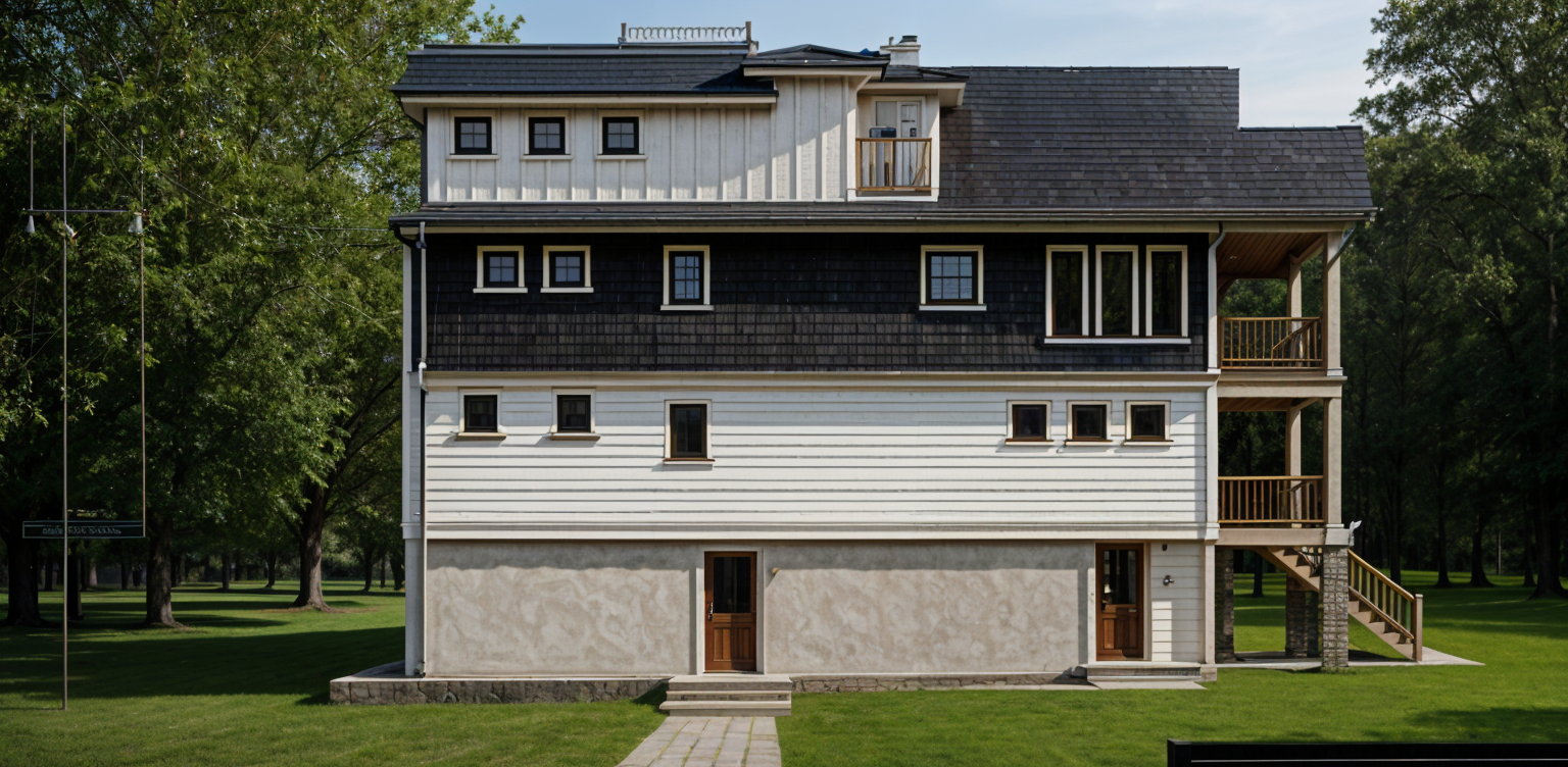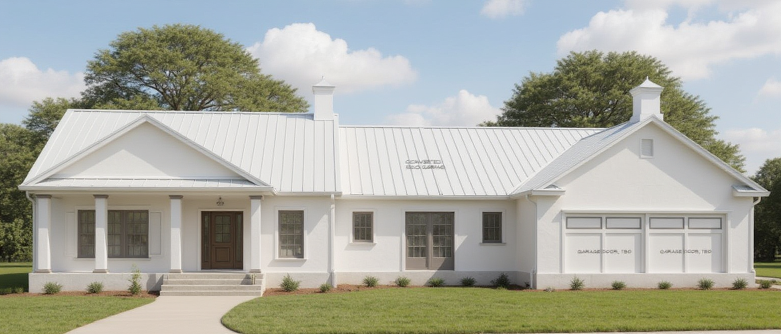 a charming modern farmhouse set in a serene landscape the house features a gray metal roof with a sleek finish elegant light gray siding and warm wooden accents on the beams and columns the front porch is adorned with comfortable seating perfect for relaxation the driveway is a pristine white contrasting beautifully with the lush green lawn and bordered by a neatly landscaped garden with vibrant shrubbery the atmosphere is peaceful and inviting with soft ambient lighting provided by the gentle rays of the setting sun illuminating through a partly cloudy sky in the background the dense greenery of a forest adds a touch of wilderness to the tranquil setting