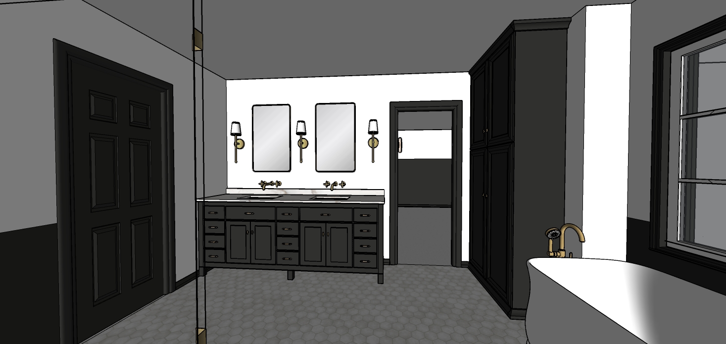 maintain all model geometry this should feel like a high end primary bathroom there should be a few square can lights with soft dim light the casework and trim should be painted in a semi gloss finish with the color from the original image the room should feel bright and airy the tile floor should be rendered as marble with the pattern shown the shower as reflected in the mirrors should also be marble tile the countertop is a white marble show wainscotting bewond the cased opening on that wall the color should match the trim show an expensive looking window treatment on the window to the right of the bathtub