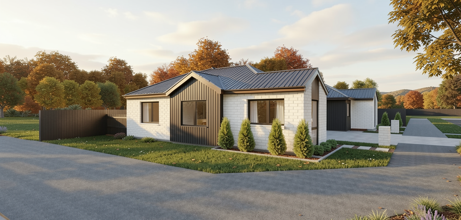 modern elevation in white smooth hardie panel lux westcoast series colour fawn soffit is wood black window frames and garage door in black