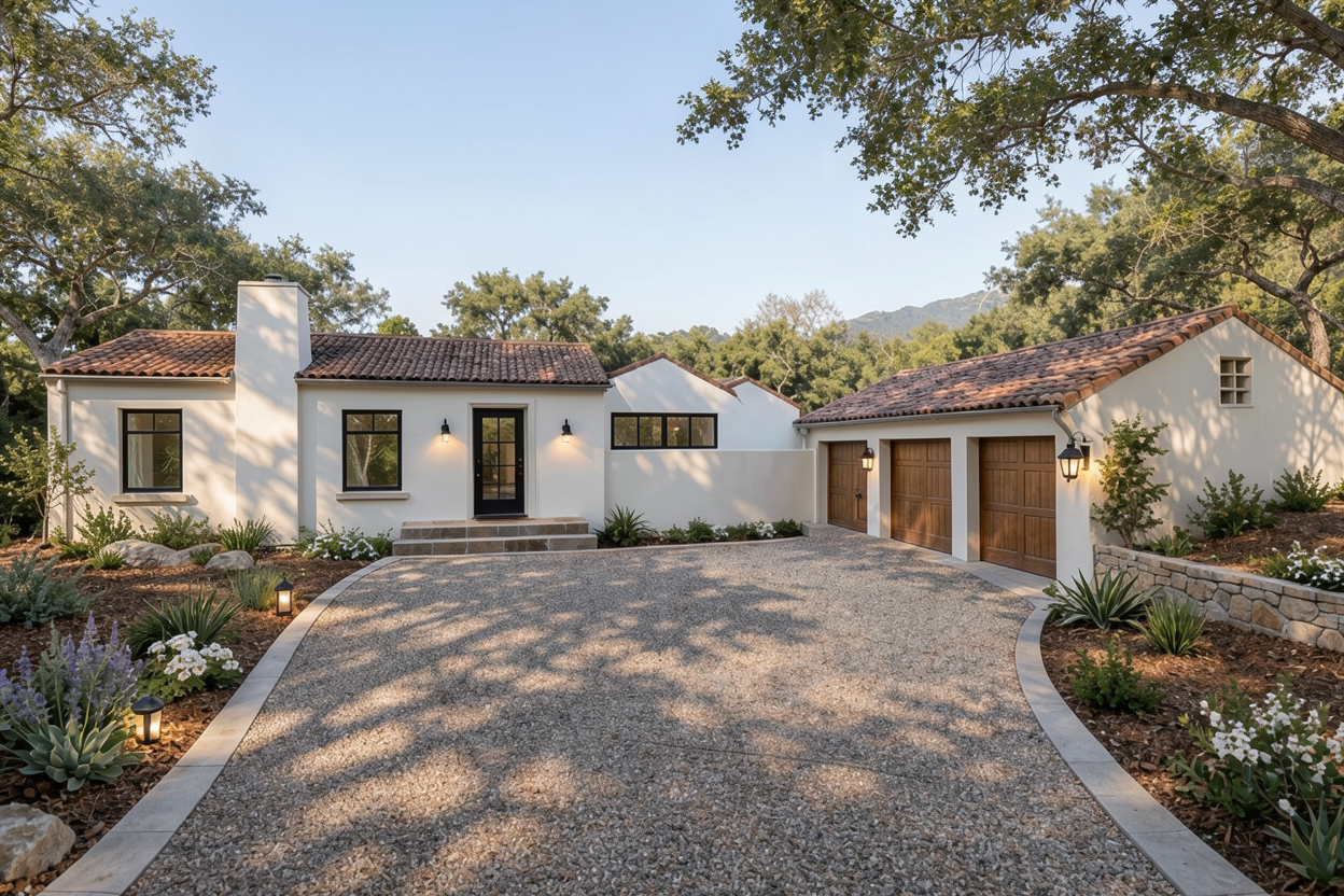 contemporary modern style add low level landscaping around house house colour scheme predominantly white show people under covered rear patio area