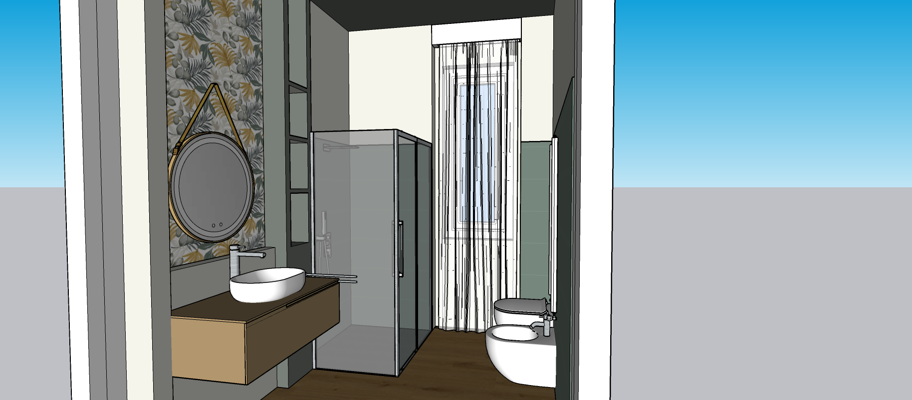 exterior shot create a realistic render of this 4 square meters bathroom with the moodboard materials attached maintein the materials position of my sketchup view