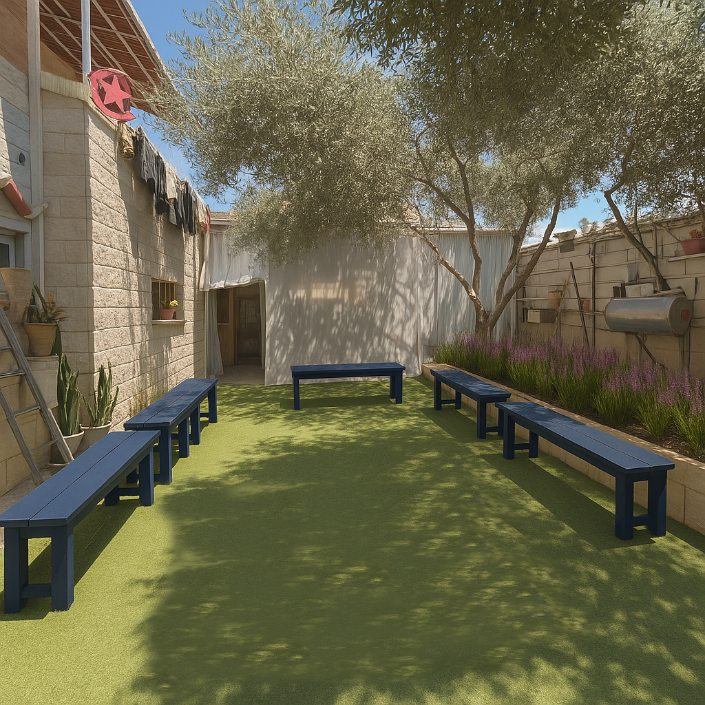 can we keep everything the same but add people sitting on the benches and a bedouin women standing in the middle front talking to them