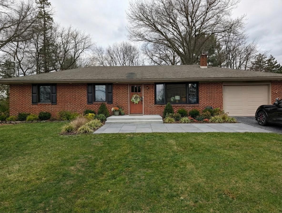 absolute rule keep all house geometry windows doors roof and garage exactly as in the photo only modify the front step sidewalk and landscaping by making it a front porch