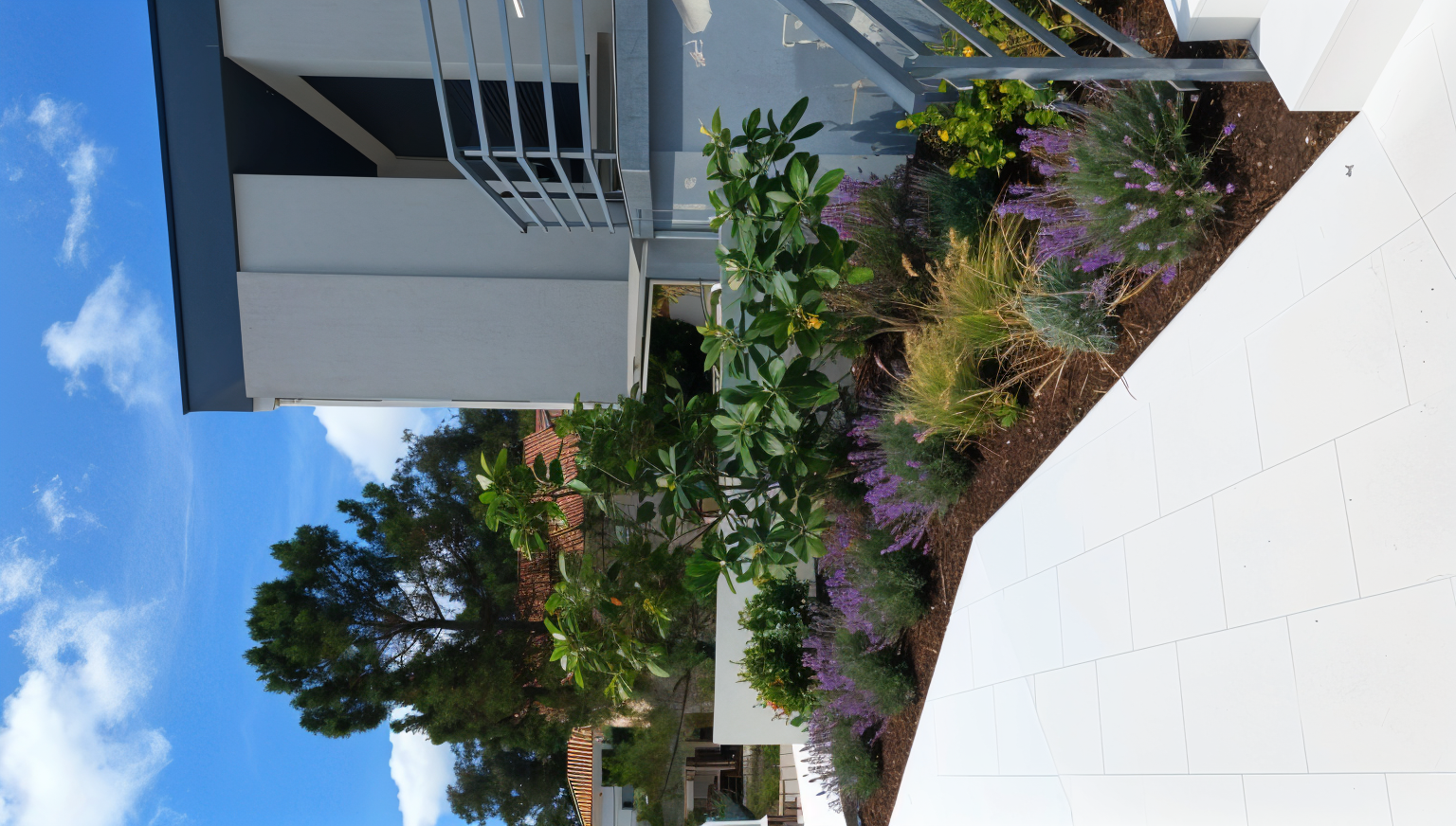 create a beautiful modern bedroom and garden with pool views