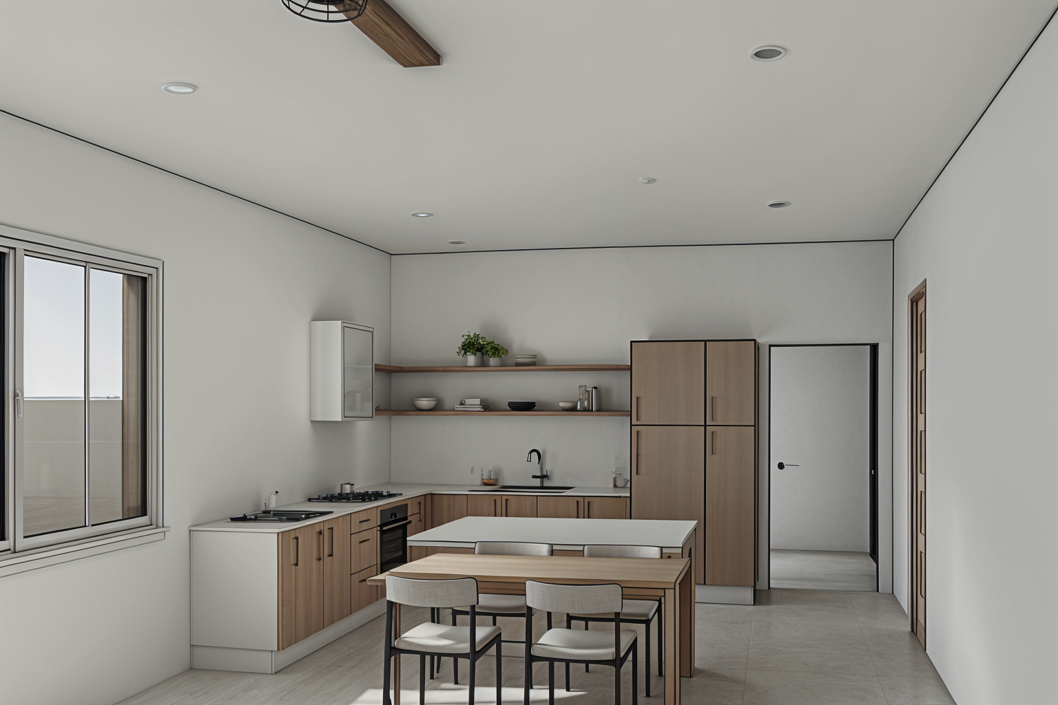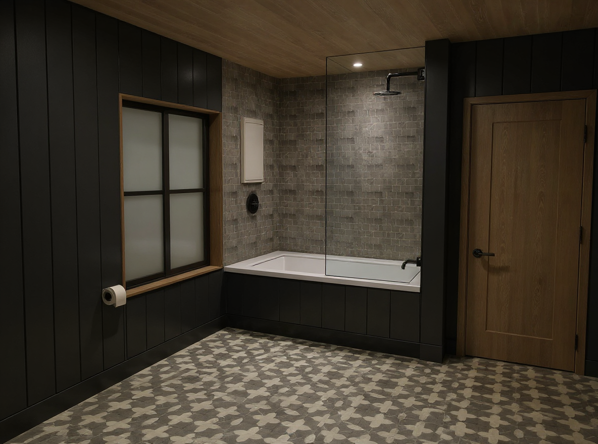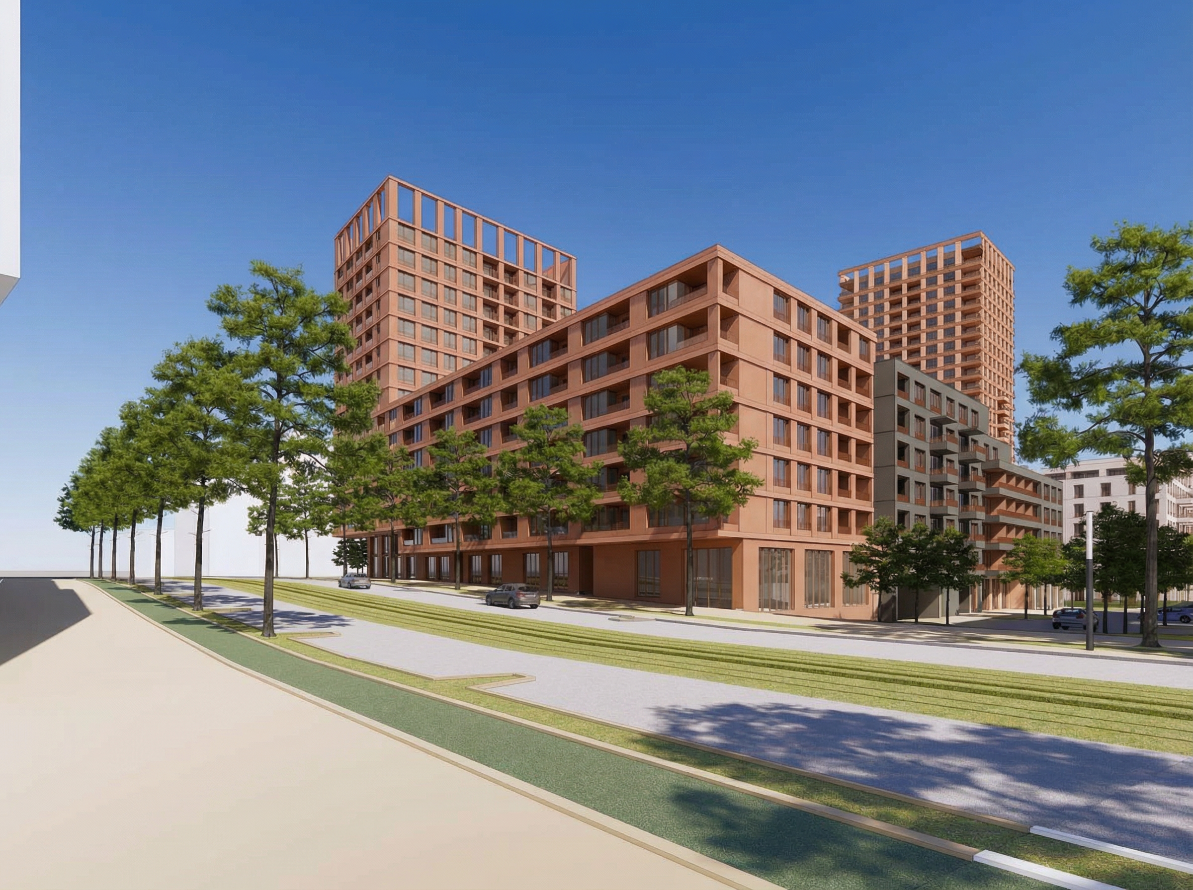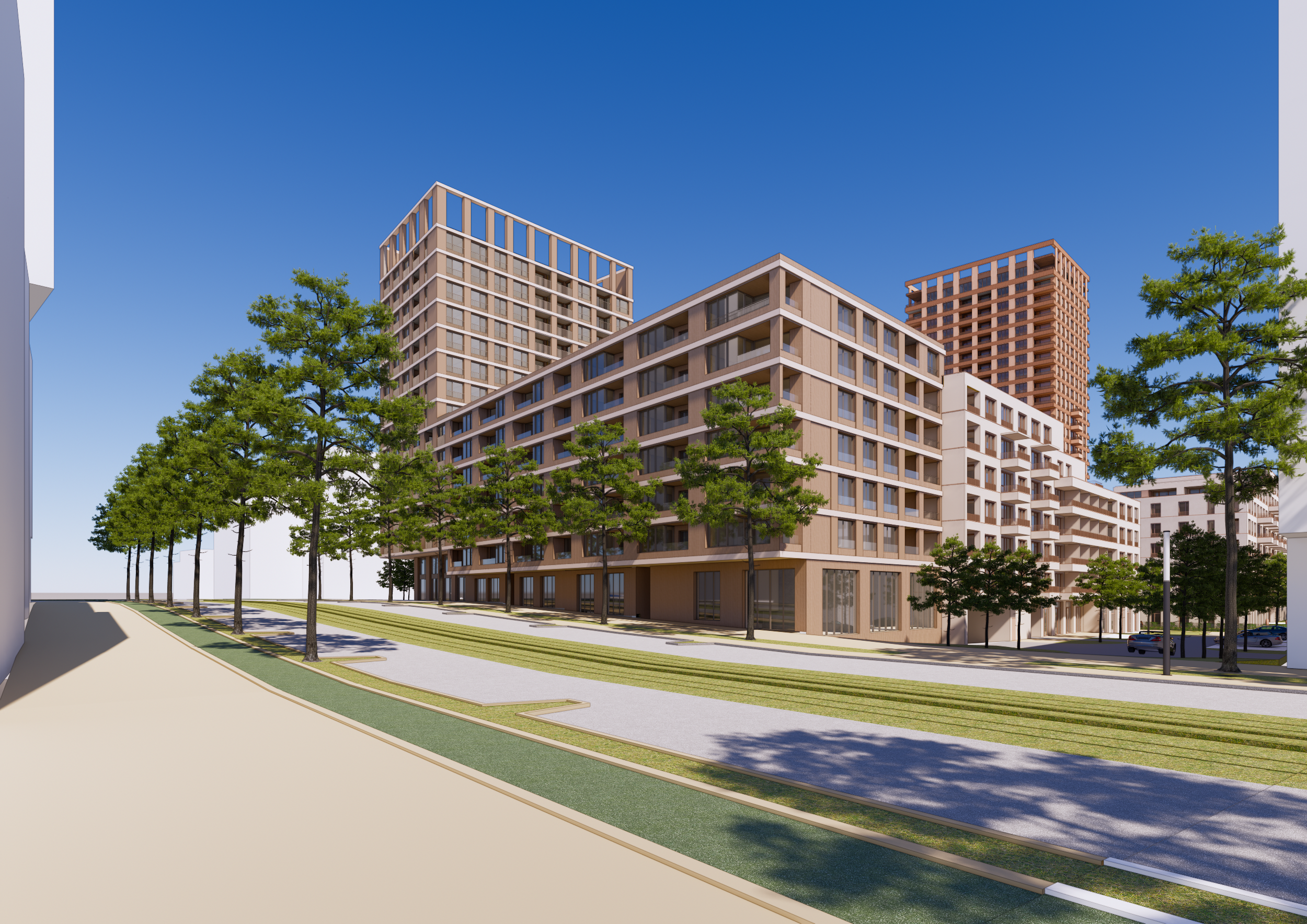 preserve exact geometry no changes to balcony grid no new shapes no added details keep facade windows and proportions exactly as in the original image do not change the balcony grid window rhythm or facade proportions no adding or removing details change middle buildings to dark ral 7039 plaster smooth facade make horizontal stripes dark vertical plaster pattern no change on high building in the right no change on white buildings no new buildings