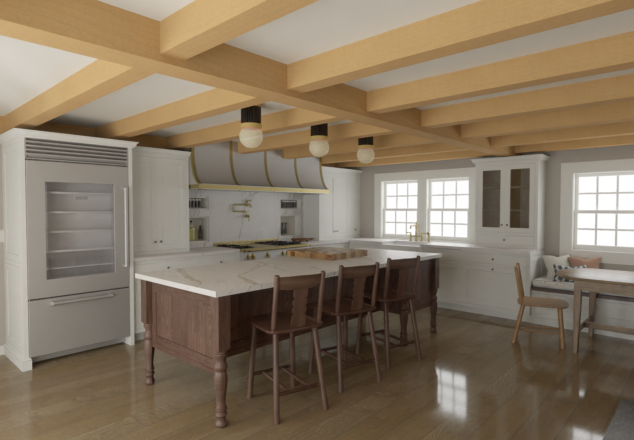 ake the provided rendering and enhance it to appear highly photorealistic and refined increase the level of detail in all materials and surfaces so they feel authentic and tactile maintain a clean minimal aesthetic with carefully curated elements nothing cluttered use natural textures such as stone wood plaster and soft fabrics to add warmth and depth improve the lighting so it feels soft cozy and natural combining warm ambient lighting with subtle daylight add small tasteful accessories so the space feels lived in but remains elegant and minimal ensure the fridge is panel ready to seamlessly match the cabinetry the ceiling should feature dark brown rustic beams and planks and the floor should be dark brown wide plank wood the final result should look like a high end luxury interior photograph with balanced composition realistic shadows and rich material depth