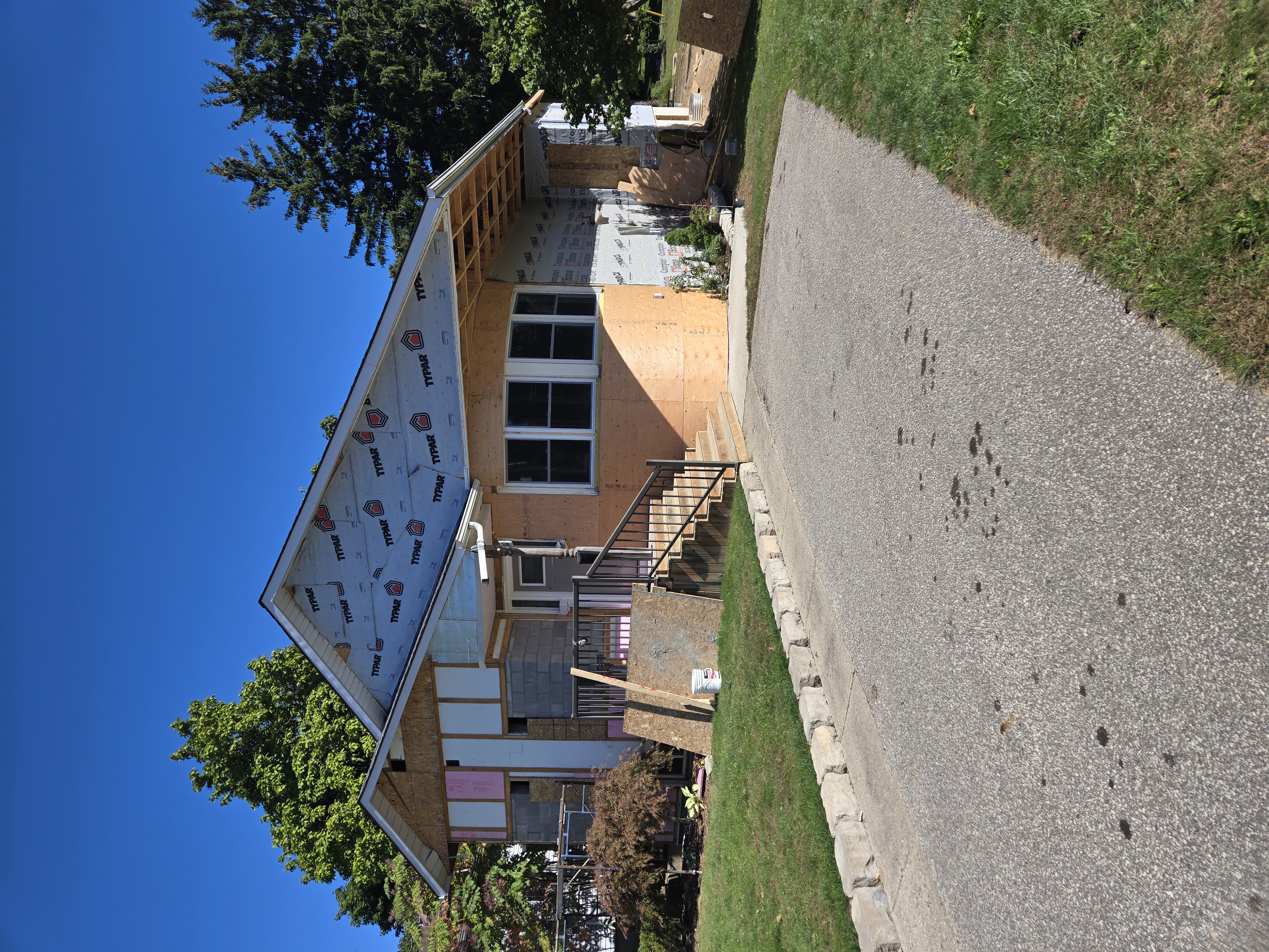 modern exterior shot white gray tone stone walls vynil shakes in gable architecture