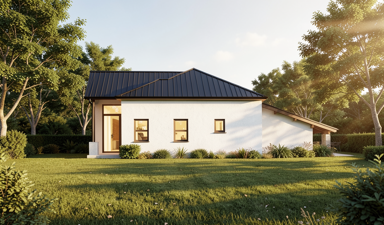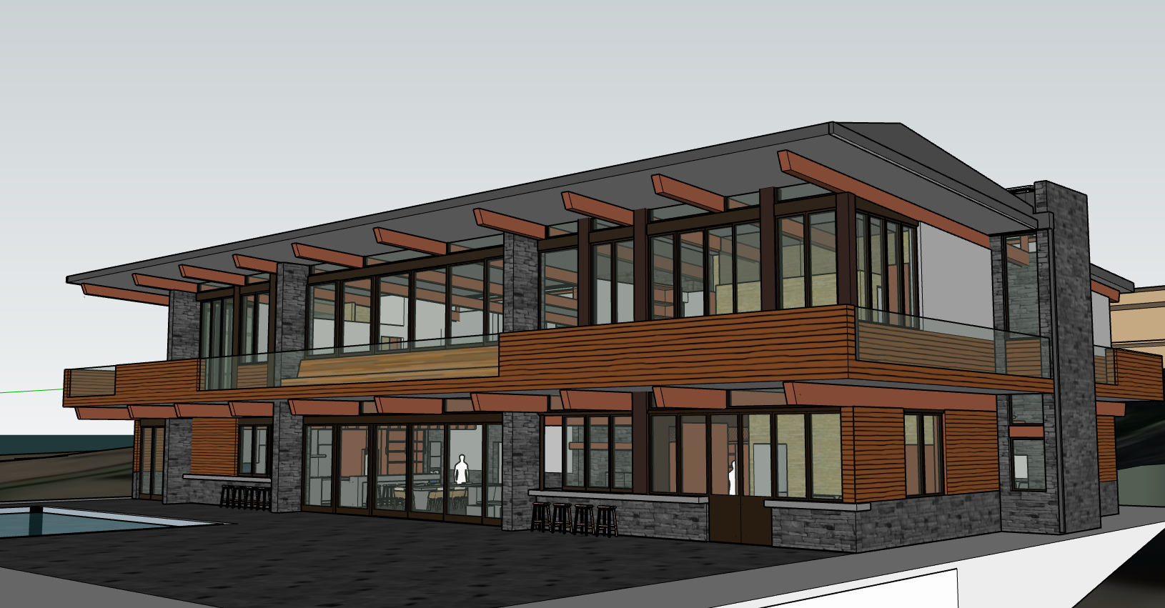 photo real rendering sited in a lush evergreen forest in the pacific northwest on a cloudy day with light atmospheric fog stacked grey field stone walnut toned wood siding exposed douglas fir glulam beams frameless glass guardrails off white plaster walls and eaves dark grey metal roof early morning soft warm interior lighting