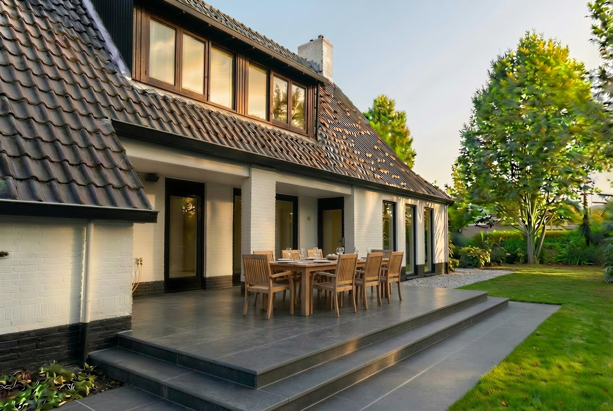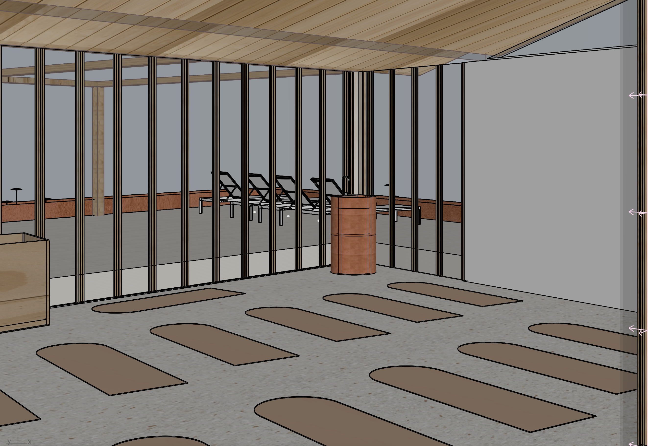 this is a view taking from inside the yoga studio the floor is light terrazzo the mats are bala weights play mat in the color sand that they have the plinth in the corner is a bespoke water drinking fountain made of terracotta the solid wall is mirrored the ceiling is planks of pine wood the glazed wall is an operable glazed wall able to be folded to open behind the glazed wall is a rooftop terrace flooring here is also light terrazzo there are 4 sunbeds as you can see out on the terrace the thicker wooden structure above the terrace outside is supposed to be holding a flexible textile shading system the terracotta you see furthest behind in the image is bespoke terracotta planters add plants in these