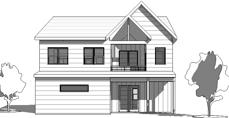 modern farm house white siding black windows gray shingle roof blue sky with clouds green lawn premium lanscaping architecture