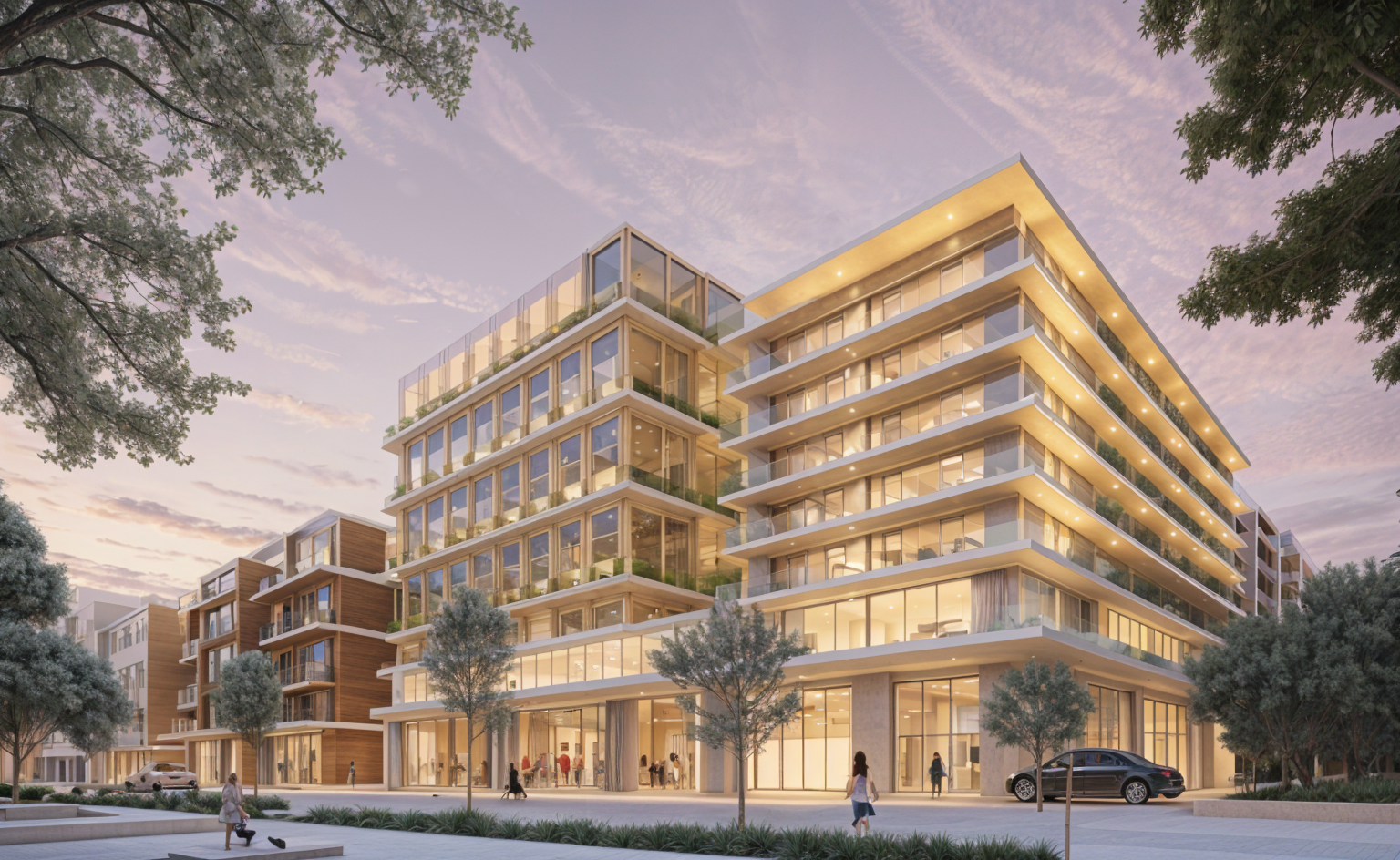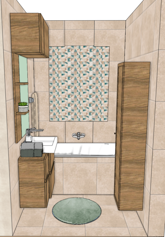 render a bathroom with a serene atmosphere the walls and floor are covered with beige tiles exuding warmth and elegance a wooden cabinet and shelves add a touch of rustic charm with their light nature oak finish the bathtub is pristine white accompanied by a sleek chrome faucet a geometric patterned mosaic tiles above the tub features soft tones of teal and beige enhancing the tranquil vibe a plush round bath mat in pale mint lies on the floor behind the sink there is a mirror round the mirror there are the furniture cabinet and shelves too the lighting is soft and inviting casting a gentle glow throughout the space