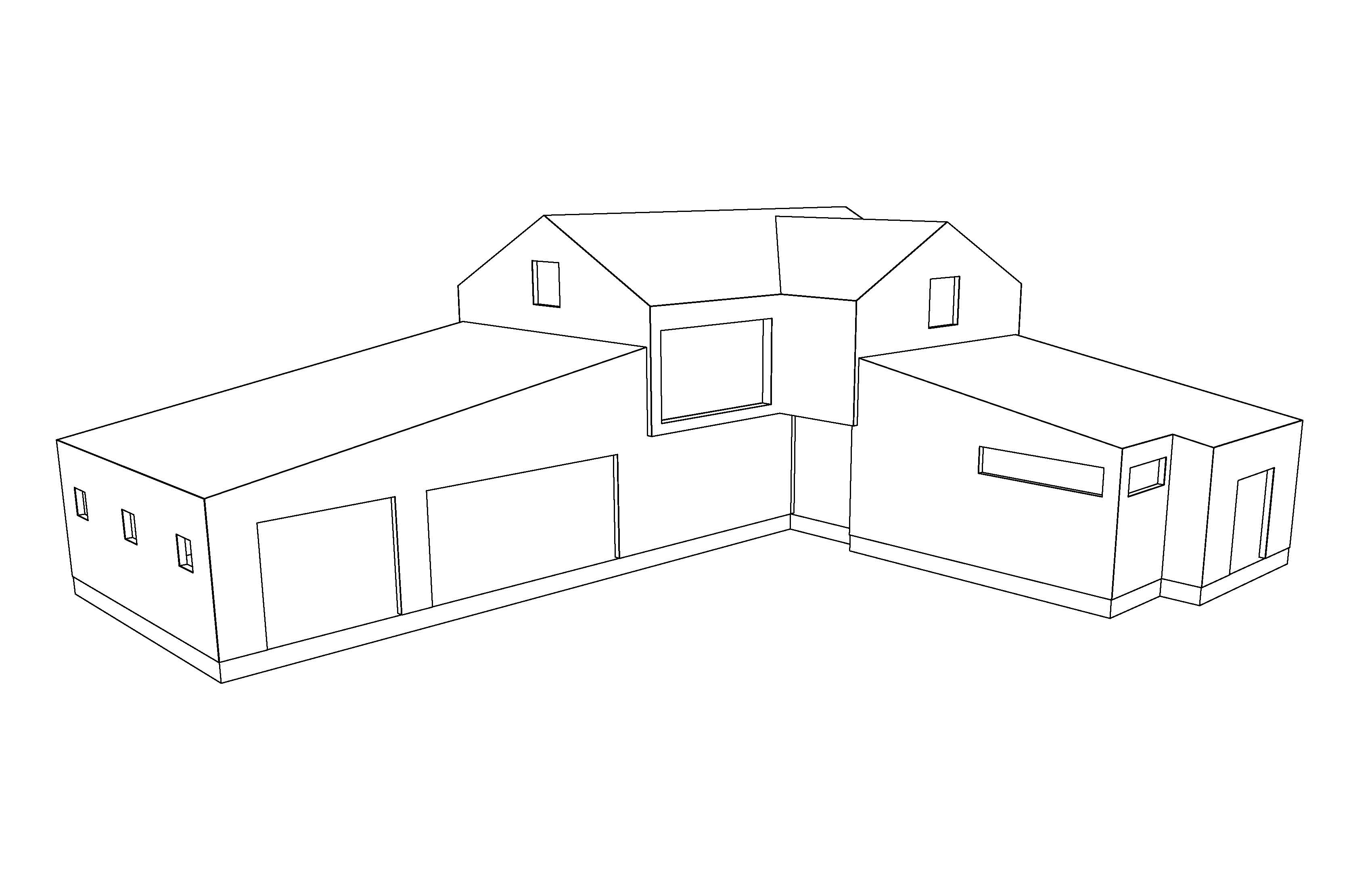 prairie style exterior shot remove adjacent buildings modern farm house gray metal siding on bottom white stucco siding on top metal roof black windows no adjacent houses wide open landscape large black garage doors no visible houses next door no wall and roof next to three windows architecture