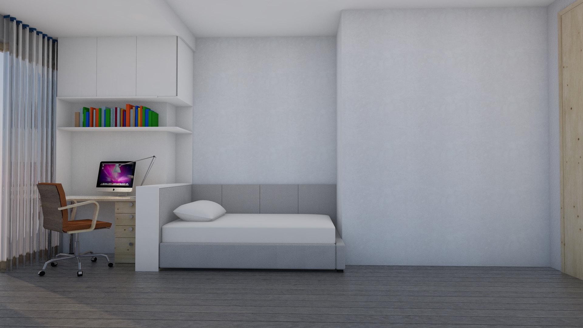 expessionism interior shot room for girl age 12 years old bed in the niche add on the bed wall picture on the left wall door on the right wall window curtain molding architecture