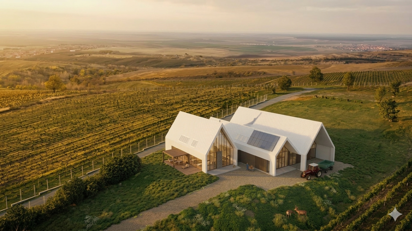 rows of grapevines grow in organized lines across the sloping terrain supported by thin wooden vineyard posts and wires the vineyard follows the natural contours of the hill creating soft diagonal patterns across the landscape lighting is warm golden hour sunset light with long soft shadows stretching across the vineyard rows the sunlight is soft and slightly hazy creating a cinematic and peaceful atmosphere colors are natural and warm deep vineyard greens dusty soil tones warm stone textures soft golden sunlight slightly desaturated sky rendering style ultra realistic landscape visualization cinematic composition natural colors soft atmospheric perspective highly detailed vegetation photorealistic vineyard environment
