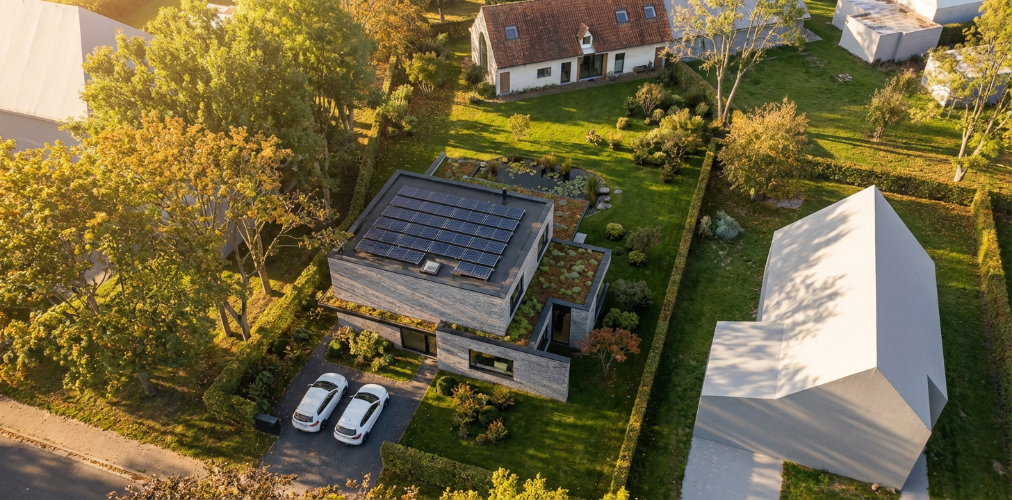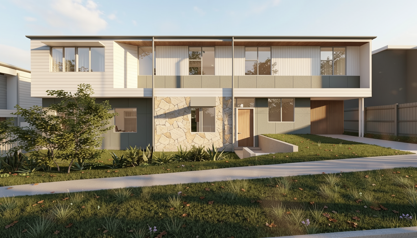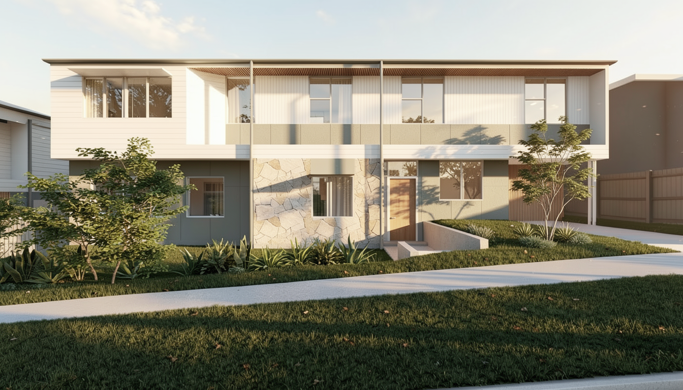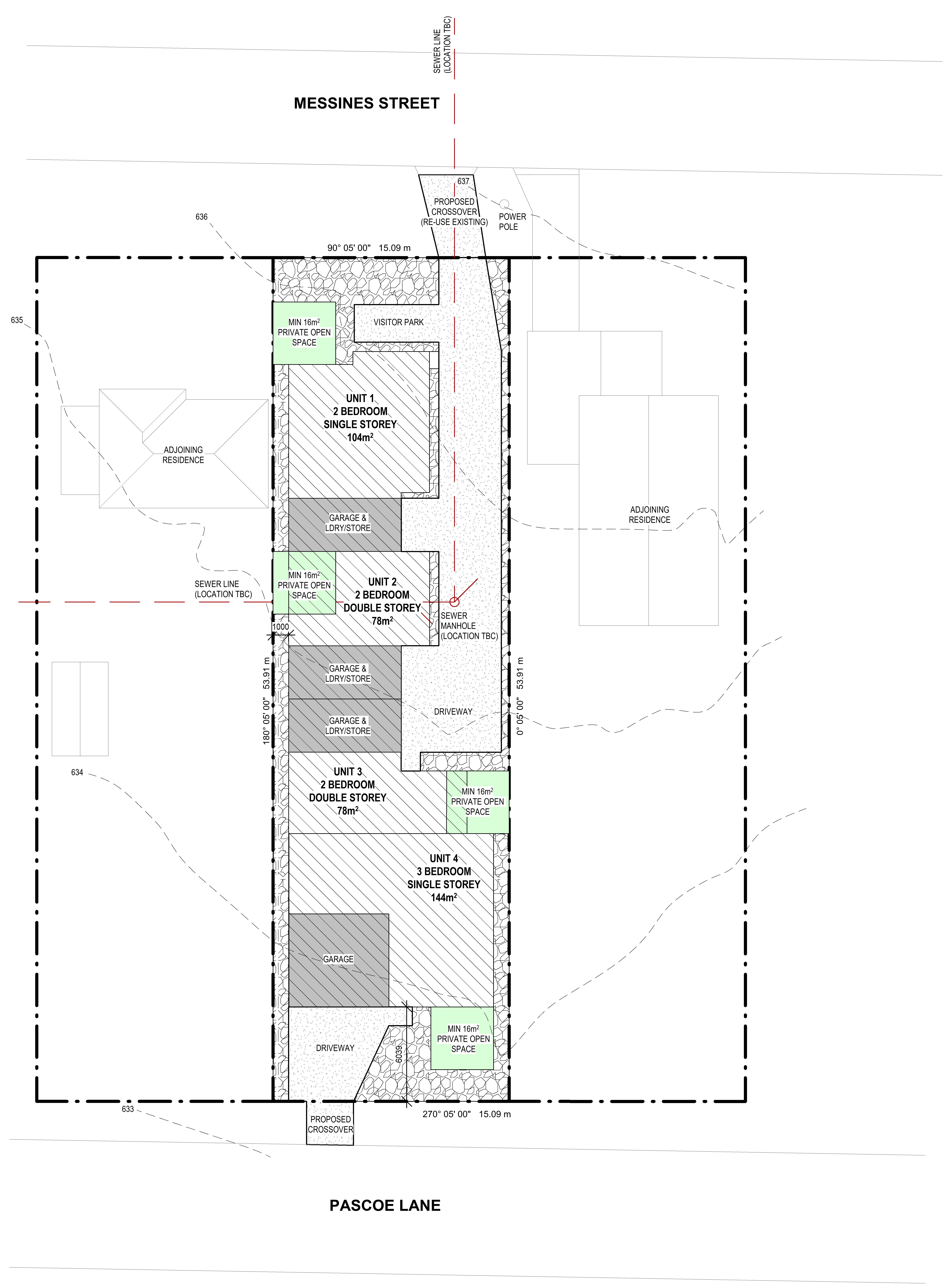 professional architectural site plan render strict top down 2d view maintain exact site boundaries dimensions building footprints driveway alignment crossover locations and all text annotations unchanged replace all pebble hatch areas with high quality landscaping including green lawn defined garden beds low maintenance shrubs and a small number of well spaced feature trees trees should be appropriately scaled for a residential development small to medium canopy not oversized add landscaping specifically along both side boundaries as soft planting buffers around private open space areas to enhance usability near visitor parking to soften hard surfaces along driveway edges without obstructing vehicle access keep driveway and vehicle circulation areas clear and fully readable do not place trees or plants within drive paths use realistic but subtle materials light grey concrete for driveway muted green lawn natural garden bed tones and soft organic planting shapes apply clean professional developer style graphics with soft shadows under trees and slight texture variation ensure the drawing remains crisp legible and suitable for client presentation do not change building shapes sizes or positions do not move or alter driveways crossovers or parking layout do not add extra structures no perspective or 3d angles no people cars or furniture do not blur or modify text do not overscale trees or overcrowd planting avoid dense forest like landscaping