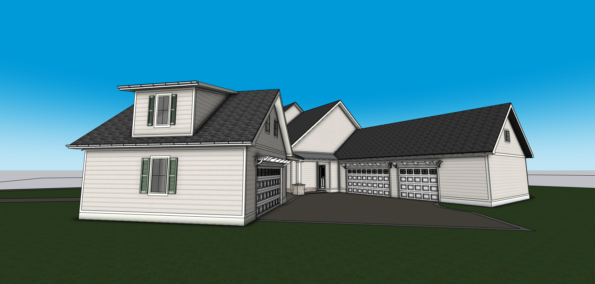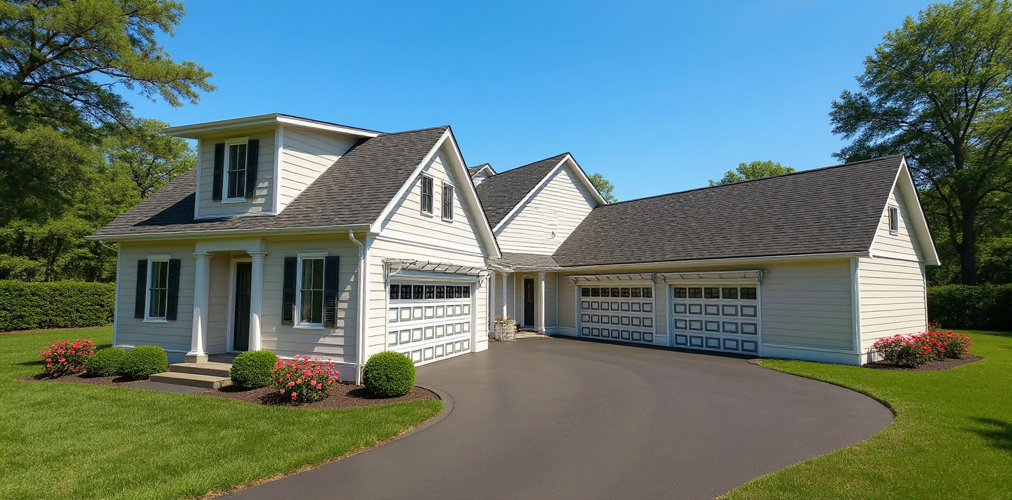 colonial style house as seen from the back where multiple garage doors can be seen white exterior charcoal roof and sage green shutters the house is surrounded by lush green shrubs and colorful blooming flowers including pink and red the pathway is a gray concrete the sky is a clear vibrant blue the atmosphere is serene and inviting capturing a sunny day with crisp vivid colors