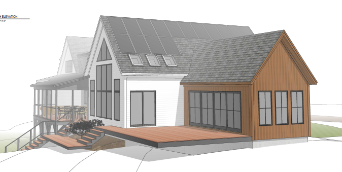 bring the deck even with the grass the white gable in the back and left should be vertical dark gray board and batten move the trees back 50 feet further add a garden beneath the three windows on the right