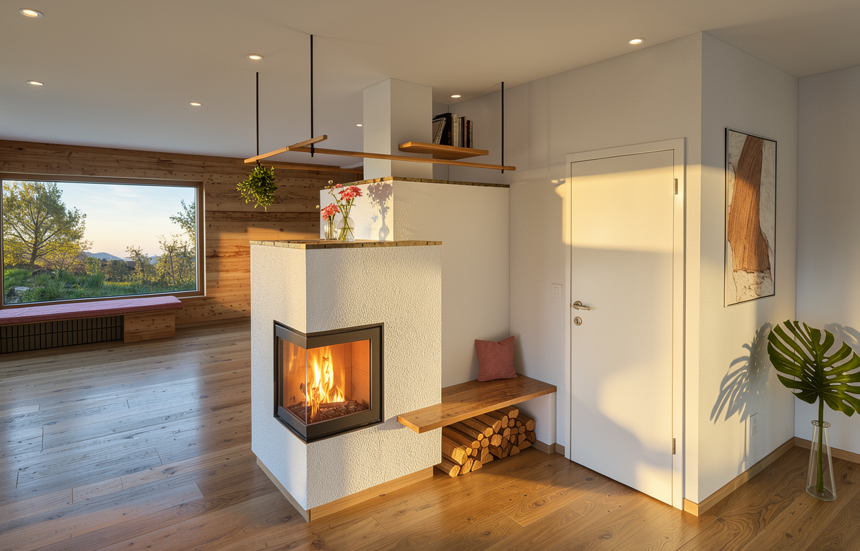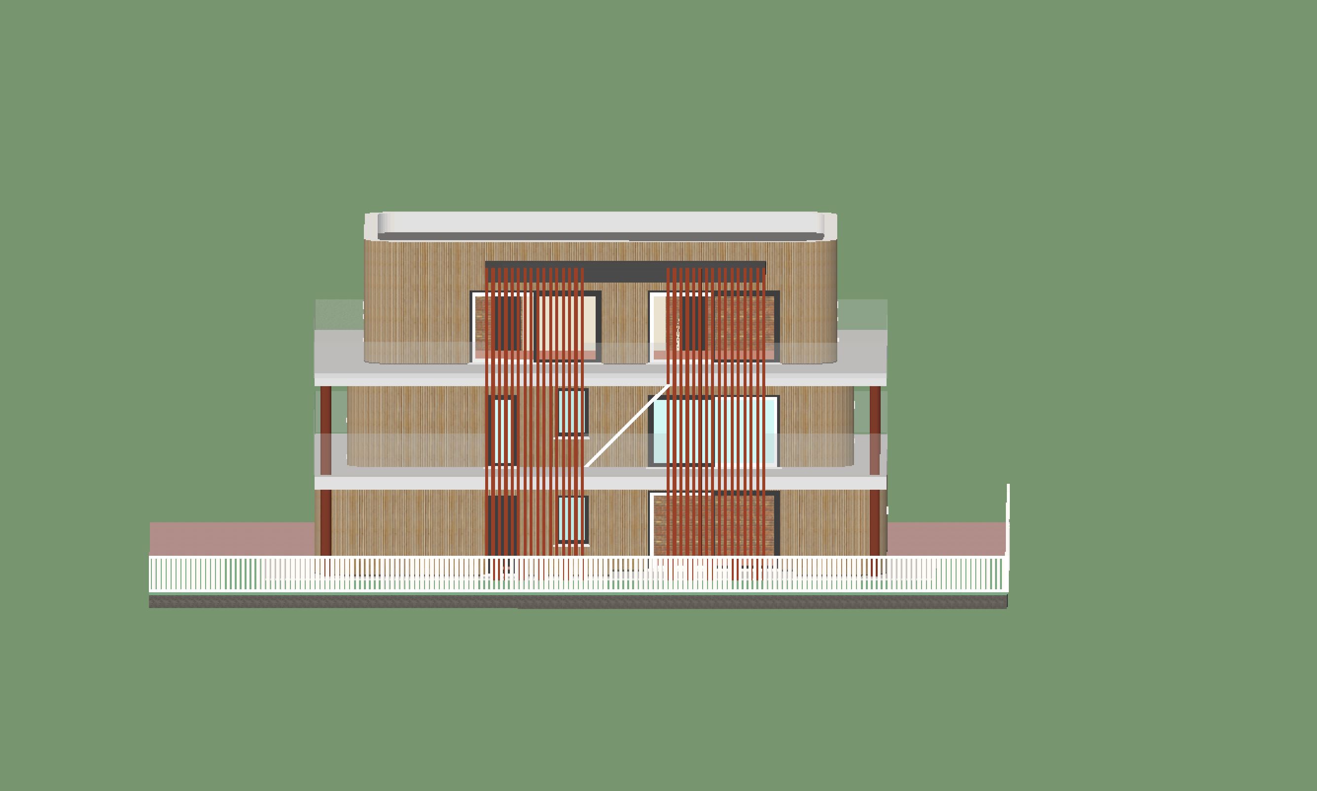 transform this image into a photorealistic rendering the building s walls are clad in wood and the window frames are black aluminum the railings are made of semi transparent glass the fence and columns are made of corten steel the urban context is within a residential area of abano terme surrounded by houses and trees the upper surface is finished in a light gray the sunshades are made of wood add some details such as cars and people on the right side of the image there is a one way street place a hedge inside the property place some tables with chairs and plants along the terraces