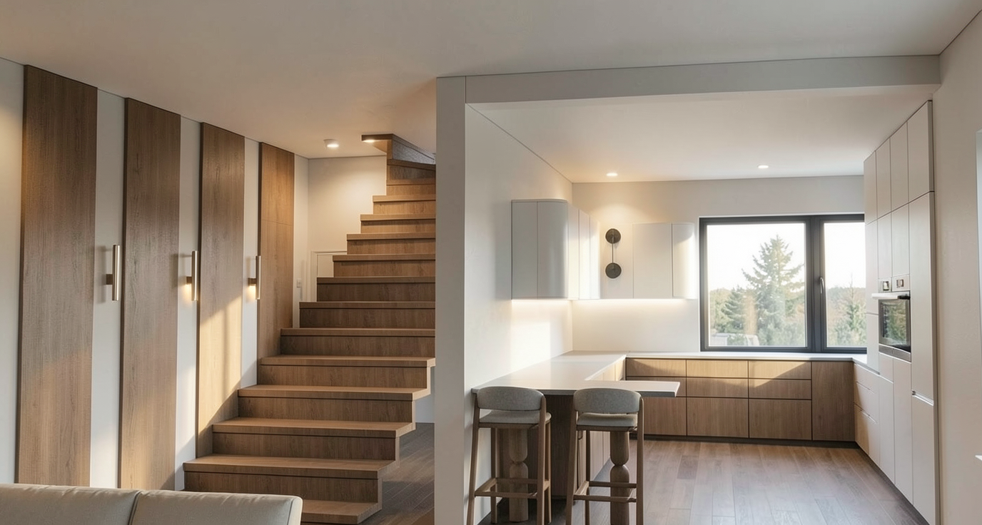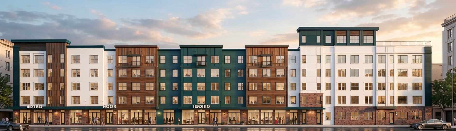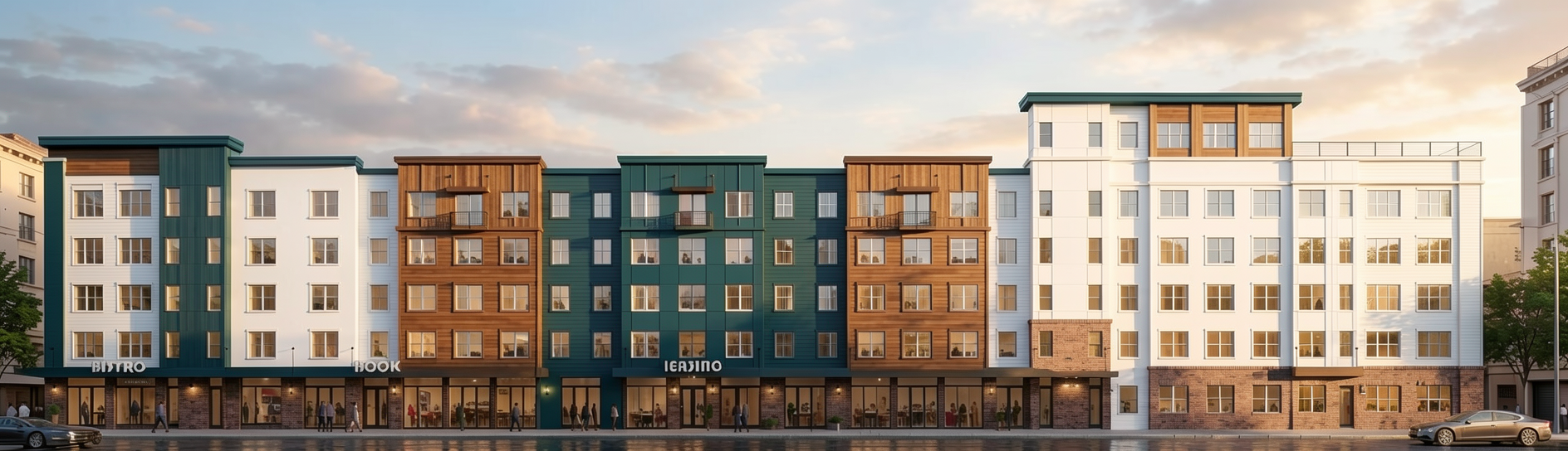do not touch anything on the first floor on the second third fourth and fifth floors make the the far right side and the far left side of the building dark teal give a mix of brown wood and white in the middle sections create some symmetry