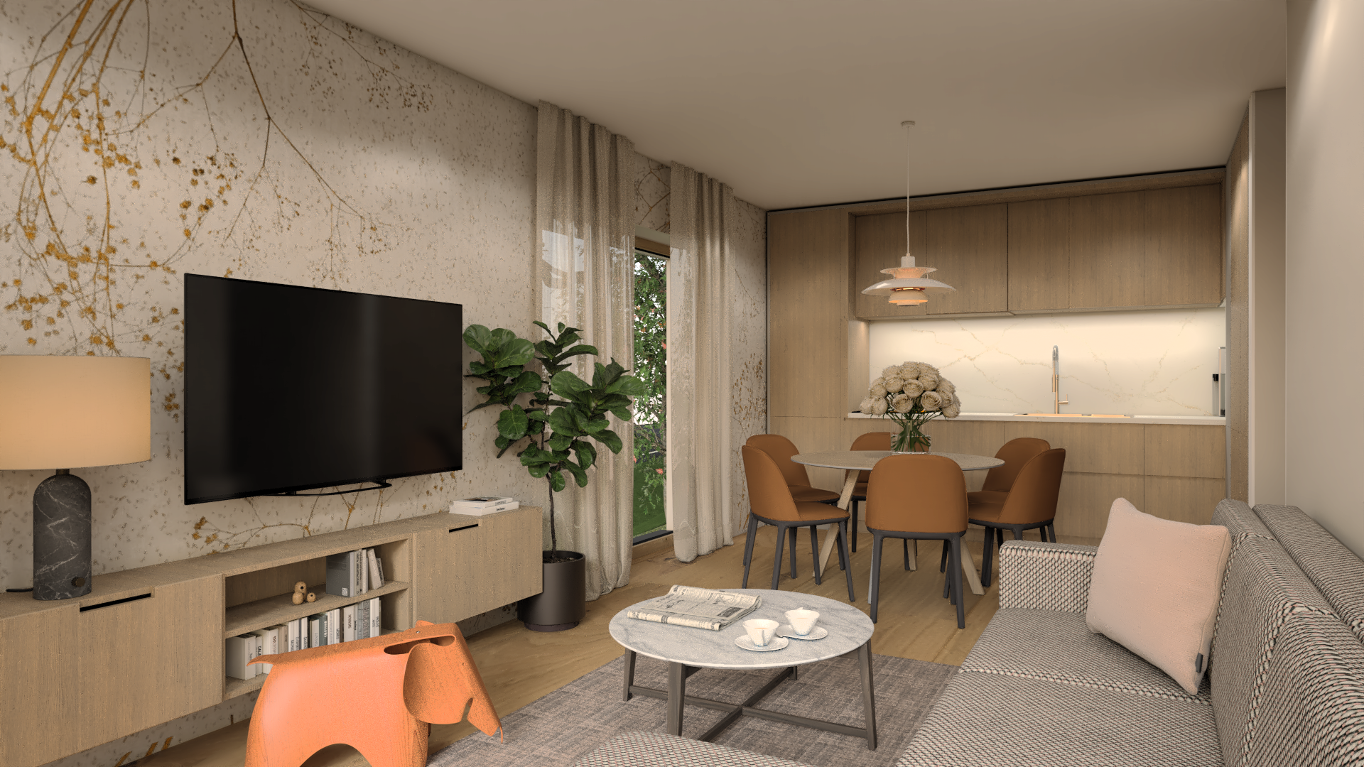 modernist interior shot make it look more realistic made for selling appartement keep colours and textures add built in light on the ceiling soft warm general light architecture