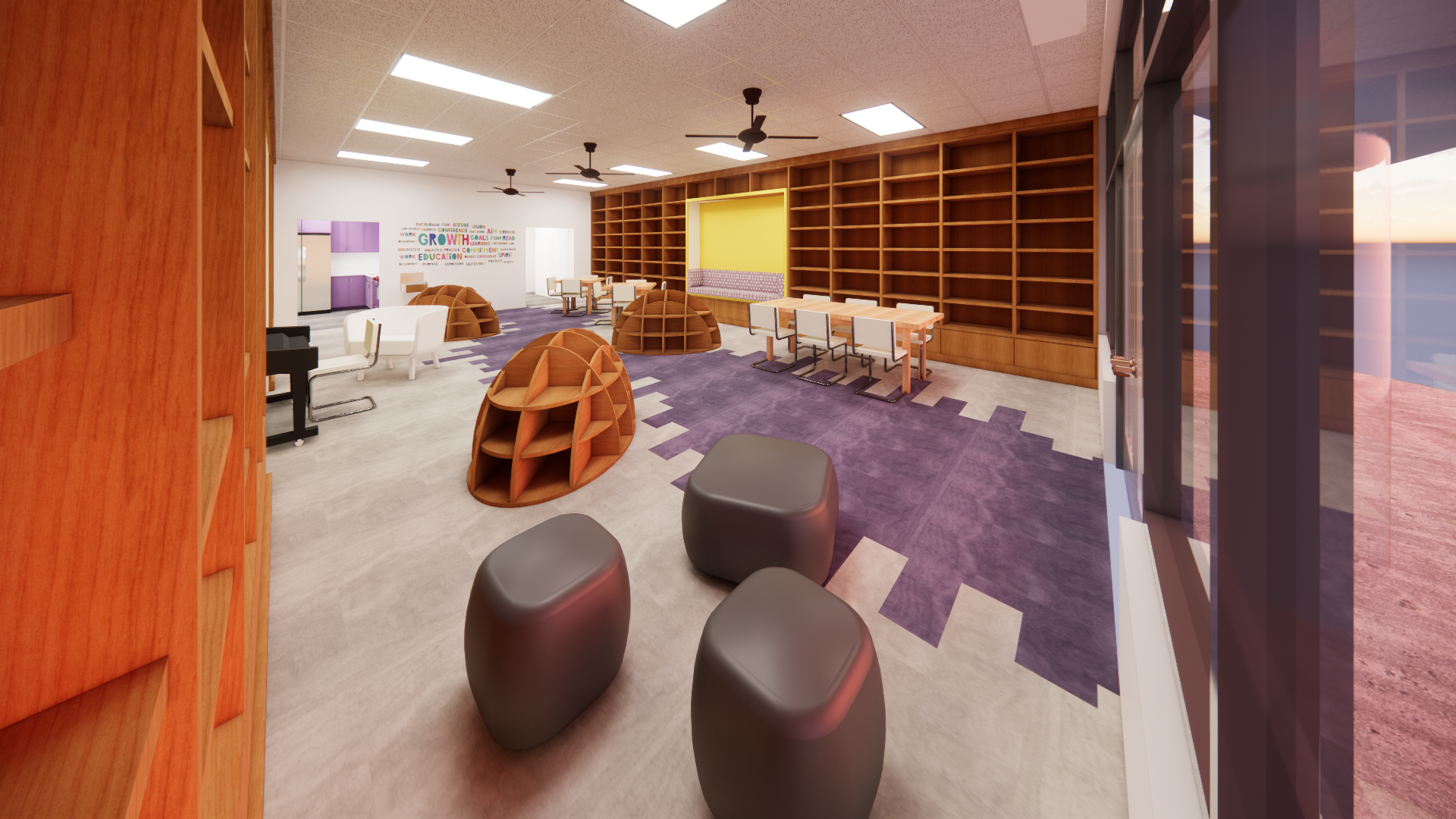 add books to the bookshalves and freestanding bookcases on all the wood stained items in this space it is a childrens library