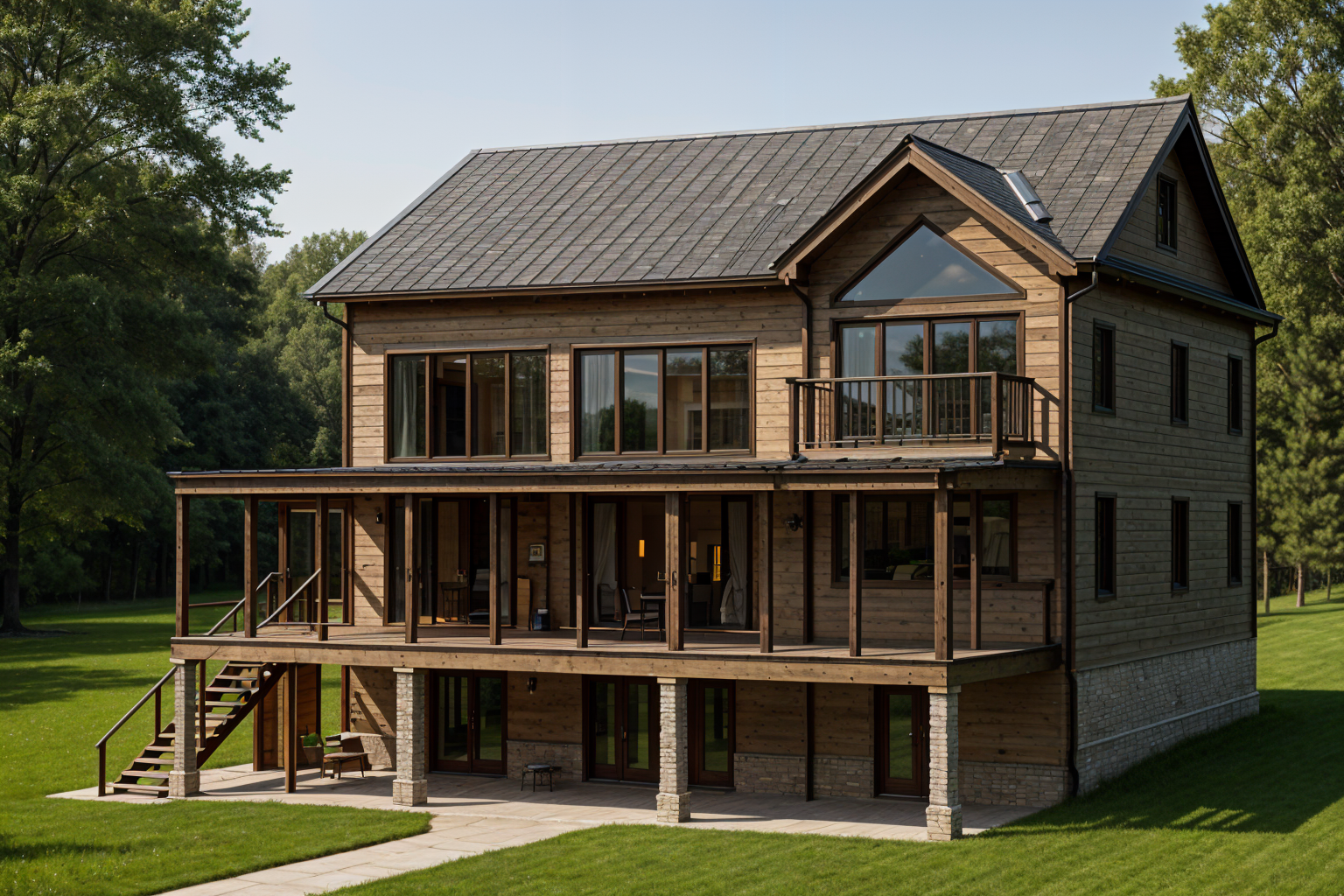 render as a craftsman style with light earth tone stone stone sill dark bronze color vertical nickel gap siding black windows and trim dark charcoal asphalt hip style roofing with 3 steps in front and grass in foreground and trees in background