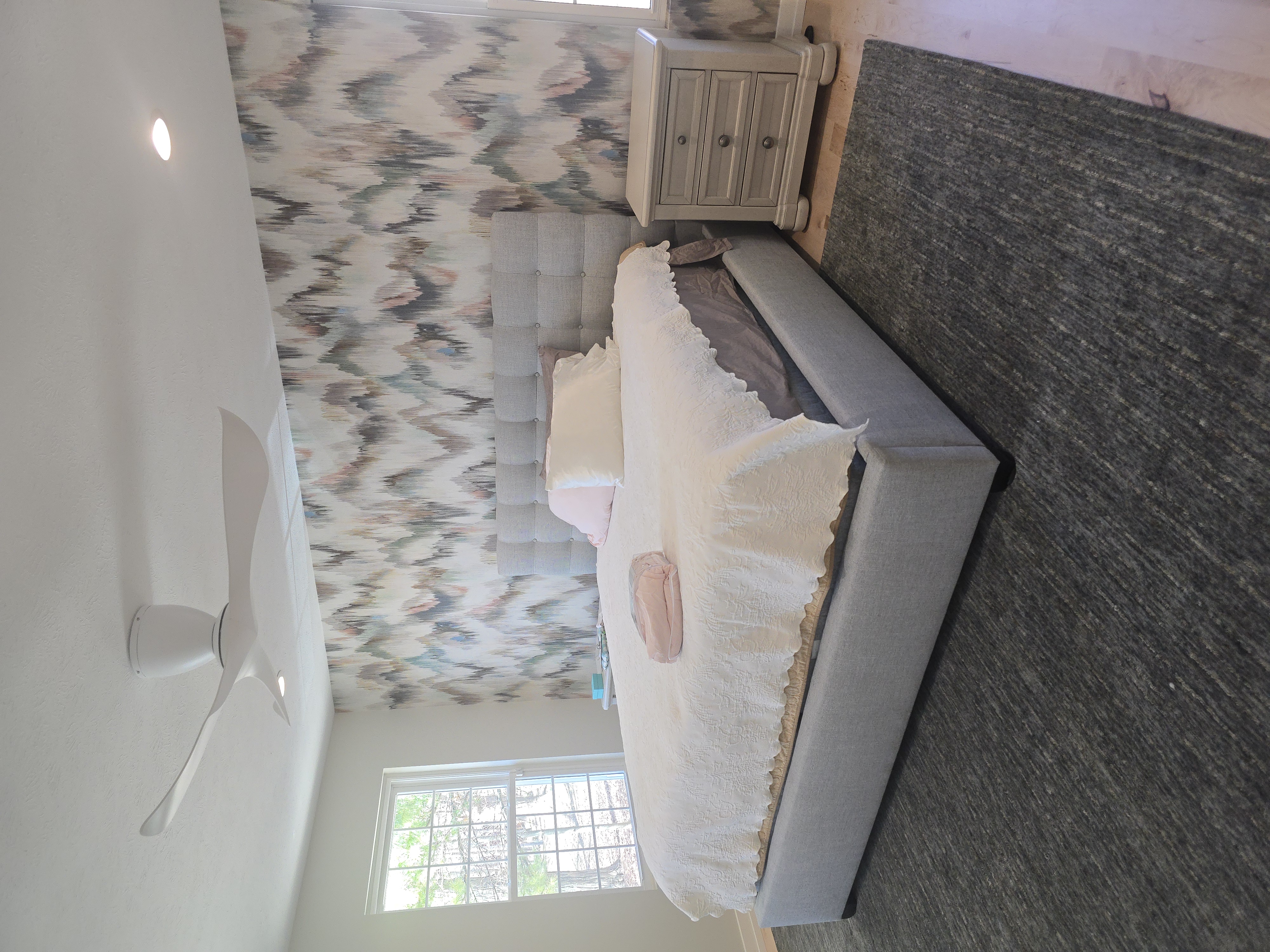 removed the pink folded sheet from the top of the bed cbange the bedding to a light grey blue cotton percale