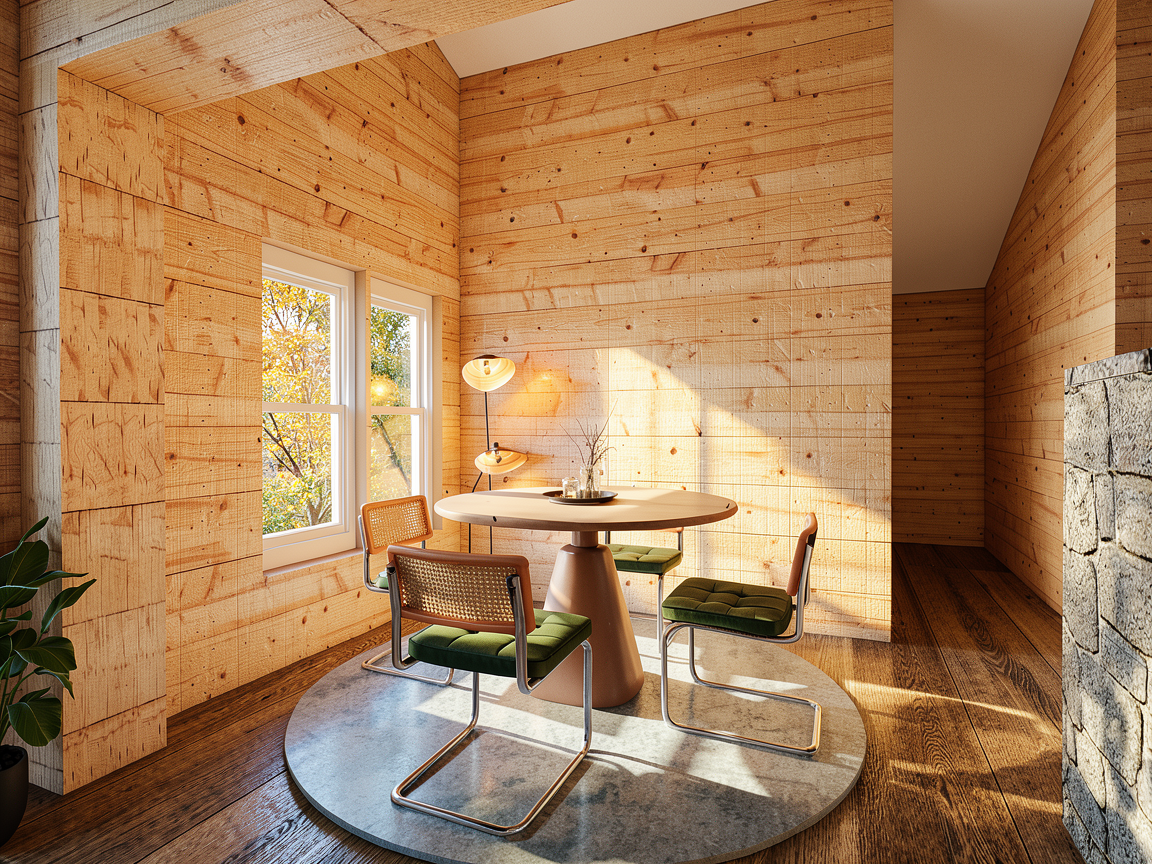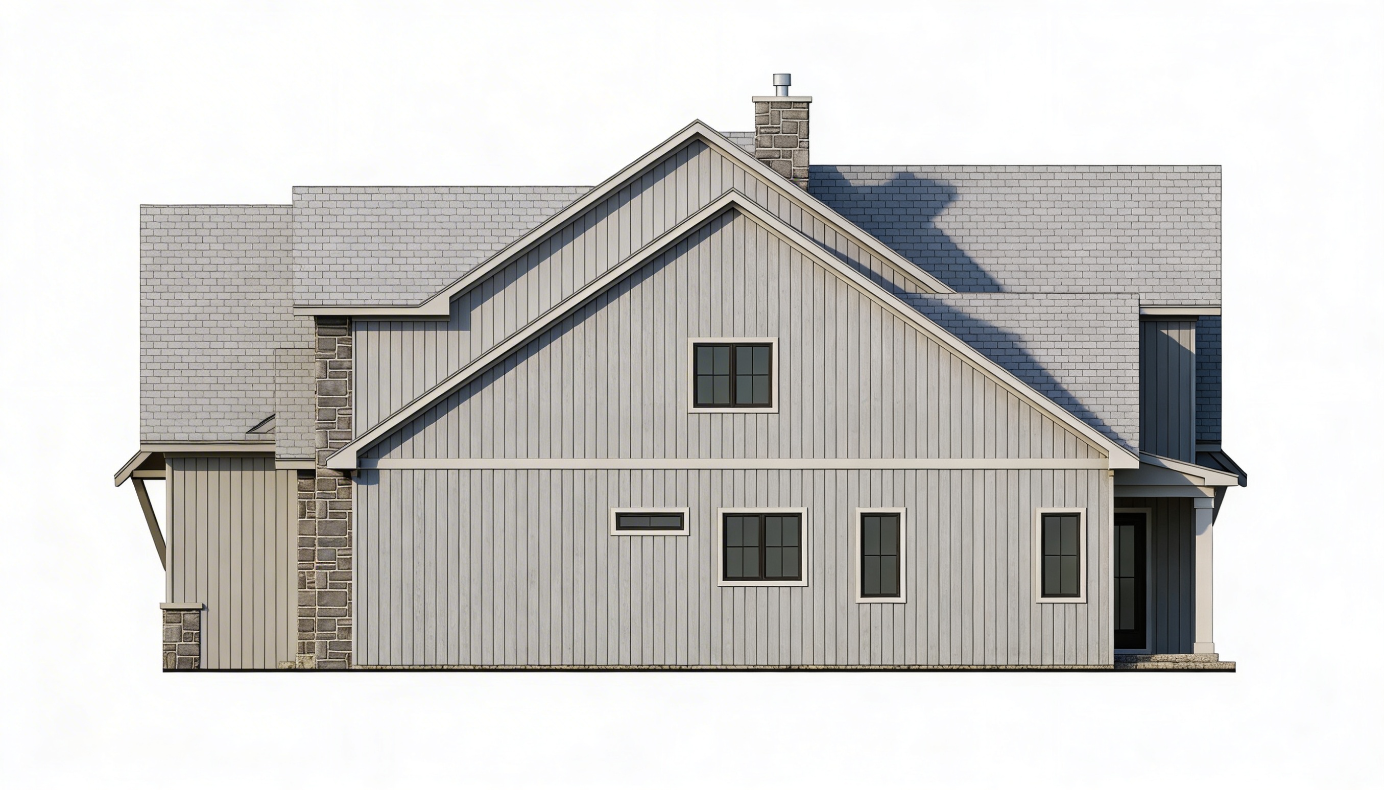 render a photorealistic 3d perspective of this house the neighbors are foggy and not visible the house is in limestone light gray with 24 lengths daytime light and reflections on the windows add neighbors each side and natural trees and planters around to show a natural image of a modern and luxury house