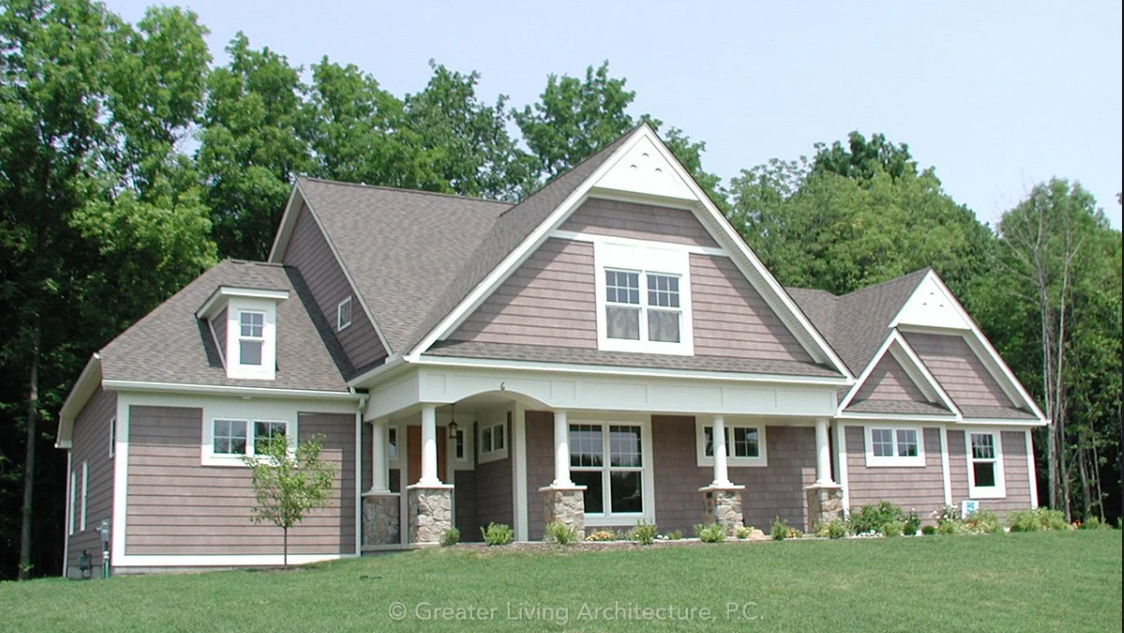 give this front exterior an updated farmhouse style leaving all structural elements as is if you could zoom out a bit more than the original image to give it more space around the house warm white board batten matte black windows natural cedar accents soft gray stone base