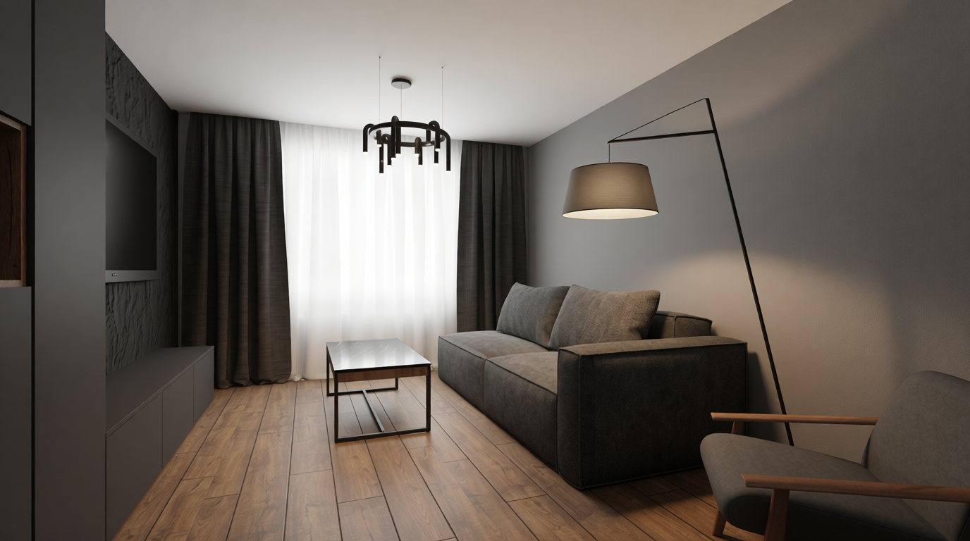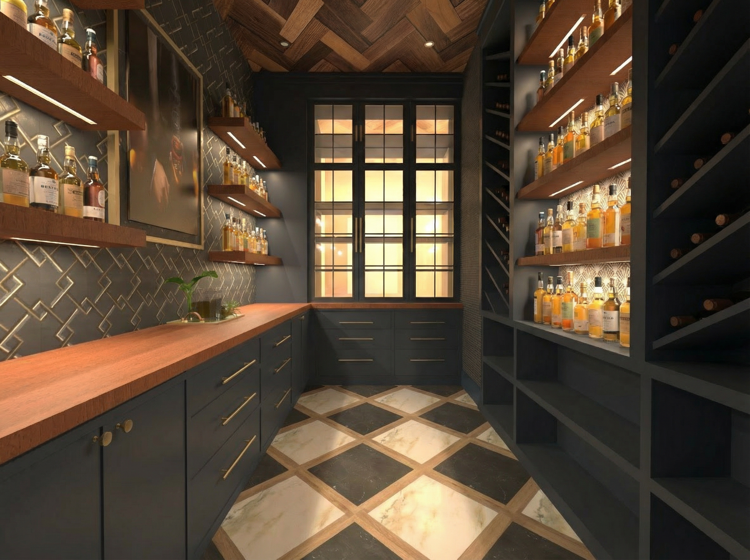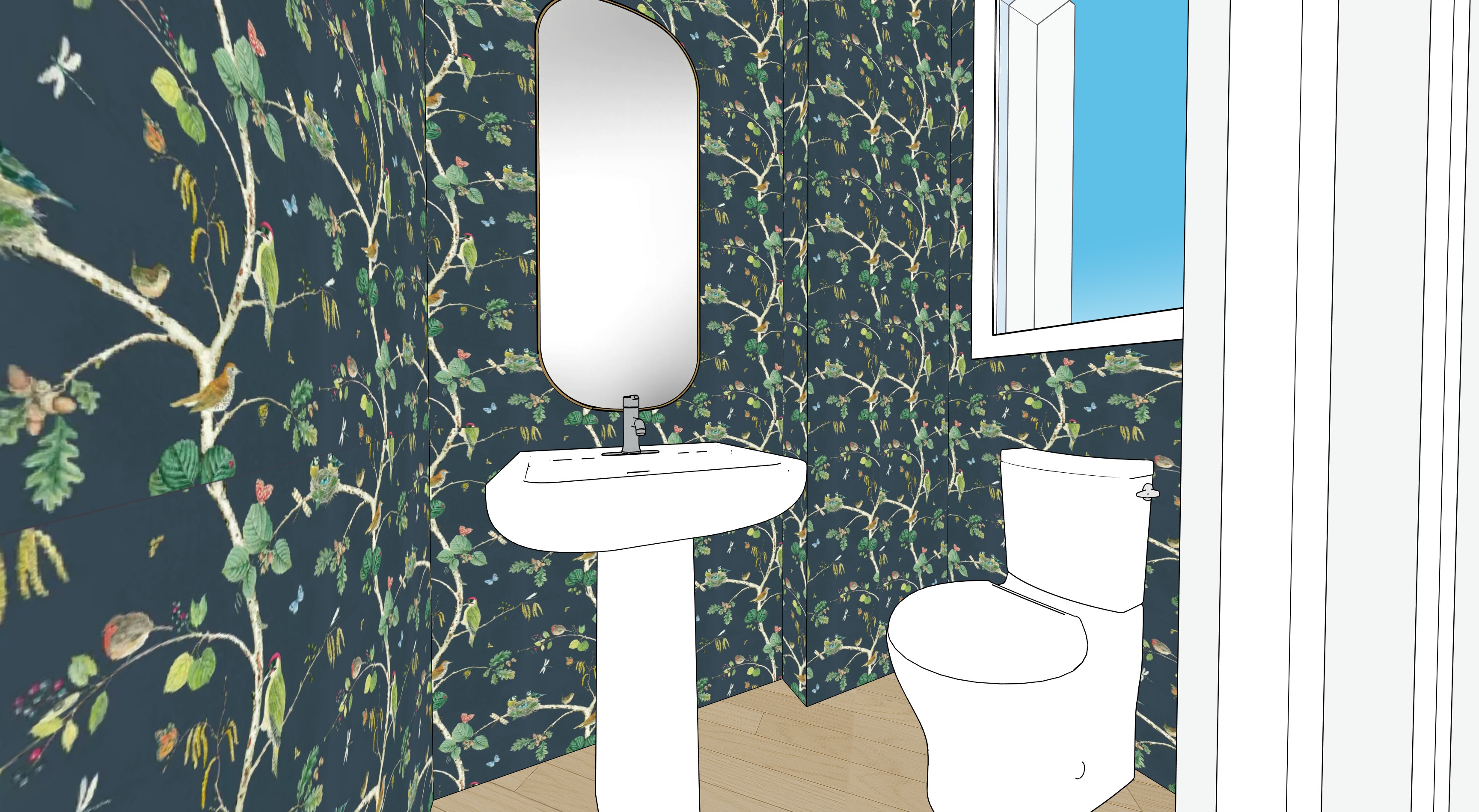 ultra realistic interior rendering of a small powder room bathroom shown from an angled perspective with three visible walls fully covered in dark navy botanical wallpaper the wallpaper features delicate hand drawn style branches with leaves birds butterflies and small floral details in muted tones of green beige soft yellow pale blue and hints of red evenly repeated across all walls at the center of the back wall there is a slim pedestal sink in matte white with a minimalist single handle faucet in brushed metal centered and aligned above the sink a tall vertical oval mirror with softly rounded edges is mounted featuring a thin warm brass or champagne gold frame reflecting light subtly without distortion to the right side of the image a modern white one piece toilet is placed against the wallpapered wall with smooth rounded contours and a closed lid clean and minimal in design the floor is finished in light natural wood planks laid horizontally with visible grain and a warm tone that contrasts with the dark wallpaper on the far right edge a white paneled door frame is partially visible with vertical grooves and next to it a small rectangular window showing a clear bright blue sky framed in white adding natural light to the space lighting is soft and even with no harsh shadows maintaining a clean architectural visualization look the style resembles a sketchup or architectural 3d render with slightly outlined edges simplified geometry and flat shading while still maintaining realistic proportions materials and color accuracy no objects are added or removed the composition remains minimal balanced and uncluttered focusing on the contrast between bold patterned wallpaper and clean white fixtures
