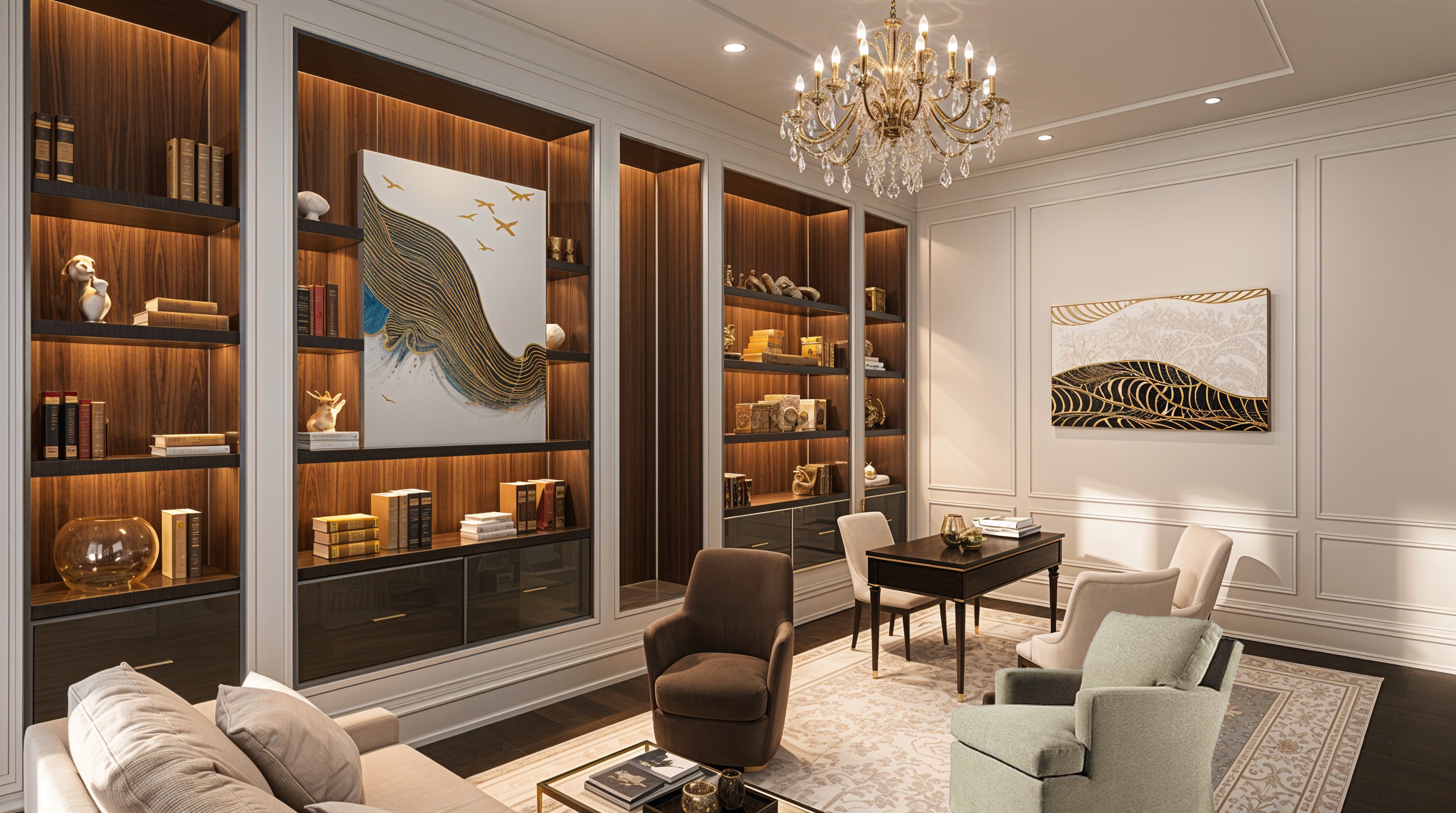make the desk slightly larger scaling it proportionally while keeping its original design material color and exact position unchanged duplicate the chair located on the right side of the image an upholstered slipcovered armchair with a skirted base rounded arms a thick loose seat cushion a large loose back cushion and no visible legs place this duplicated chair in the position directly in front of the sofa replacing the existing chair in that location change the upholstery color of both chairs of this same model the original chair on the right side and the duplicated chair to a warm coffee brown tone keeping the same fabric texture finish and softness adjust only the scale and perspective of the duplicated chair and the resized desk so they align perfectly with the existing camera angle and spatial depth do not alter any other furniture or objects do not change materials textures lighting shadows reflections architecture floor patterns walls or ceilings no redesign no stylistic changes no enhancement the goal is exact duplication controlled color change and correct perspective only