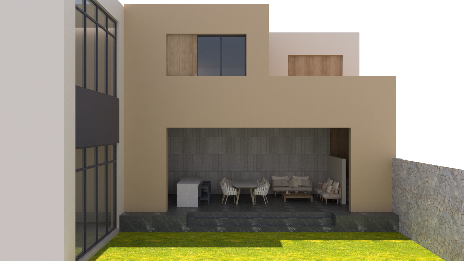 modern exterior shot modern minimalist architectural design elegant beige facade sleek black framed windows wooden panel accents cozy outdoor living space with cream cushions grey stone wall lush vibrant green grass serene and tranquil atmosphere soft gradient sky blending from light blue to pink architecture
