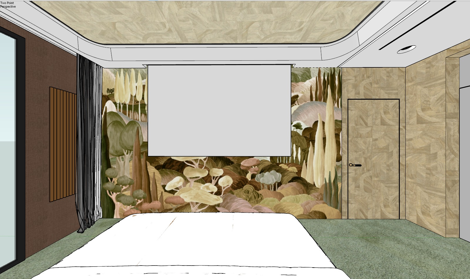 render a modern bedroom with a calming and cozy atmosphere the walls should have a textured wooden pattern in light beige adding warmth and depth the bed is upholstered in olive green fabric with plush beige and striped black and white pillows enhancing comfort the bedding is crisp white with subtle grey patterns upper wall cabinets are sleek and contemporary combining dark brown and black finishes the floor has a soft muted green carpet large glass doors with sheer white curtains let in natural light creating an airy feel overall use soft earthy tones to create a serene and inviting environment