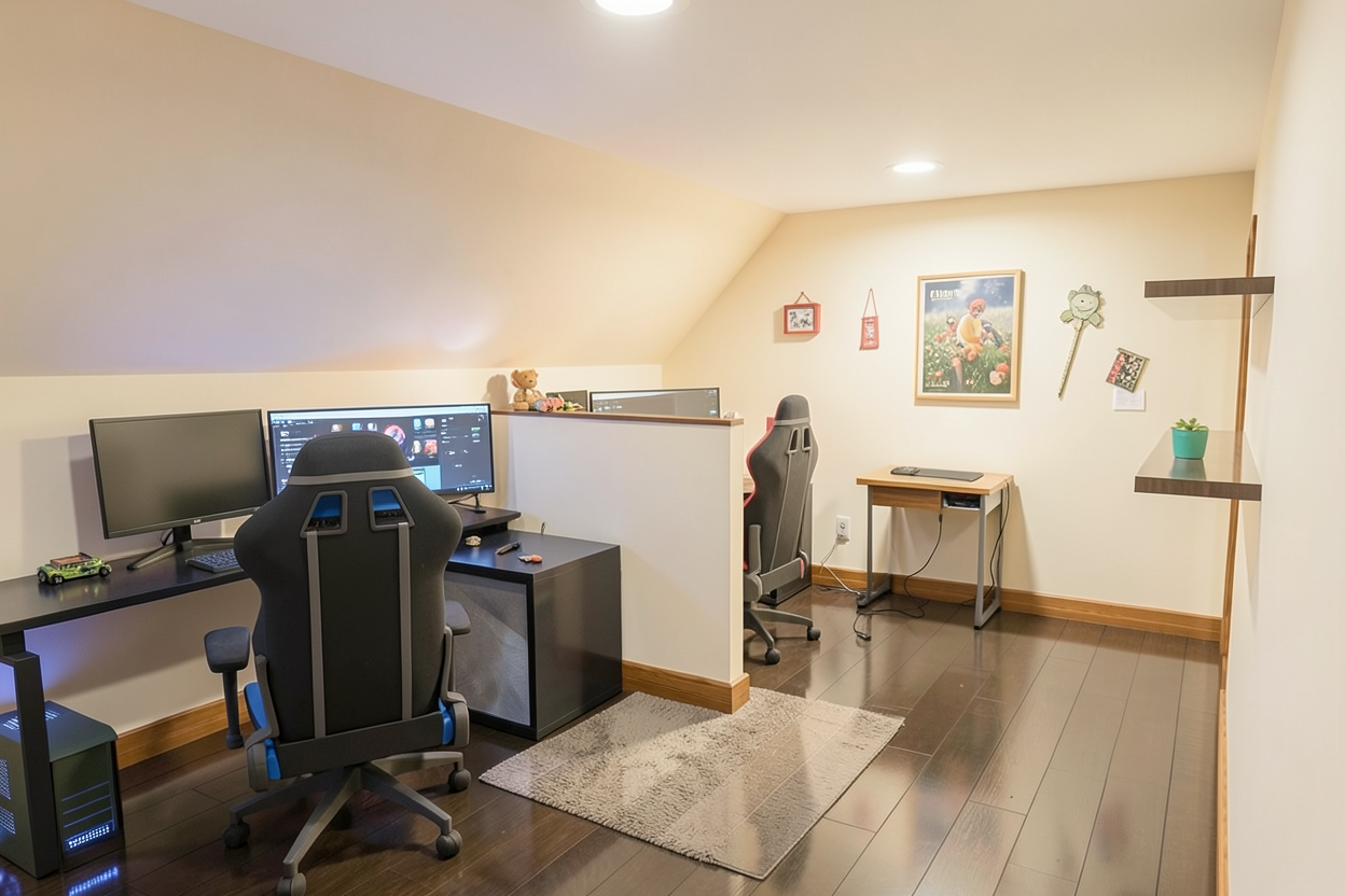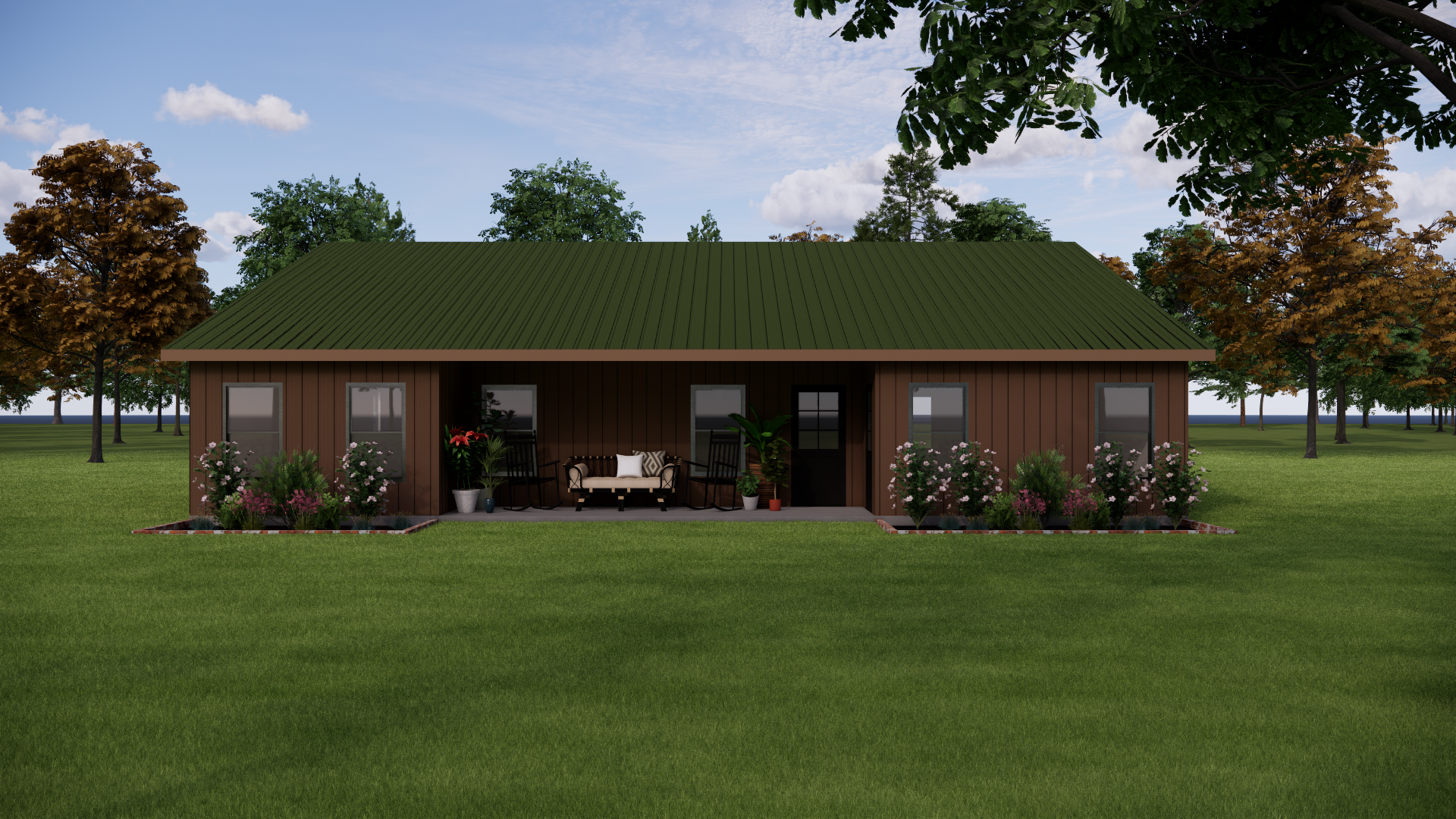 you are a professional image renderer you create the highest grade renderings around and specialize in architectural renderings this is the front elevation of a house create a high resolution photorealistic image of this structure keep the windows as they are where they are keep the doors as they are where they are keep the main structure as it is where it is feel free to change the perspective keep the roofline as it is where is it do not add anything to the structure that i have not asked for the roof is forest green metal architectural style the siding is metal medium brown in town the background will be a pastoral north texas farm it should be early afternoon with a bright sunny day clear skies the landscaping should be summertime with plenty of color
