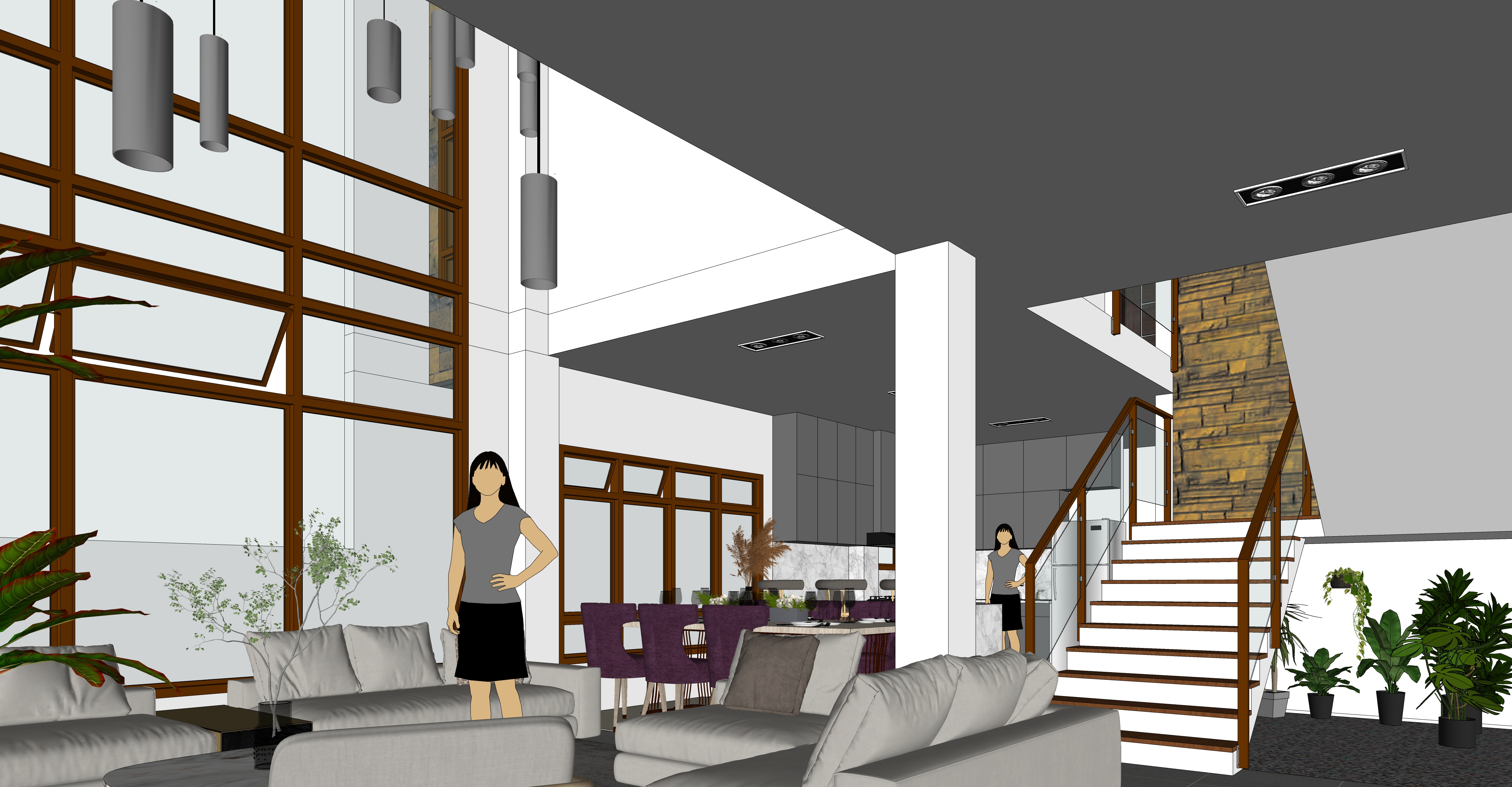 contemporary interior shot create a stunning modern interior living space the room is spacious with a high ceiling featuring large floor to ceiling windows framed in warm chestnut brown wood allowing natural light to flood in the color palette consists of soft grays for the plush sofas contrasted with dark purple dining chairs the floor is a sleek dark gray enhancing the contemporary feel elegant gray pendant lights hang from the ceiling casting a cozy glow the staircase has wooden steps with a glass railing leading up to a loft area a feature wall is adorned with textured golden stone lush green indoor plants in white pots are arranged throughout adding life and color the atmosphere is inviting and serene exuding minimalist elegance architecture
