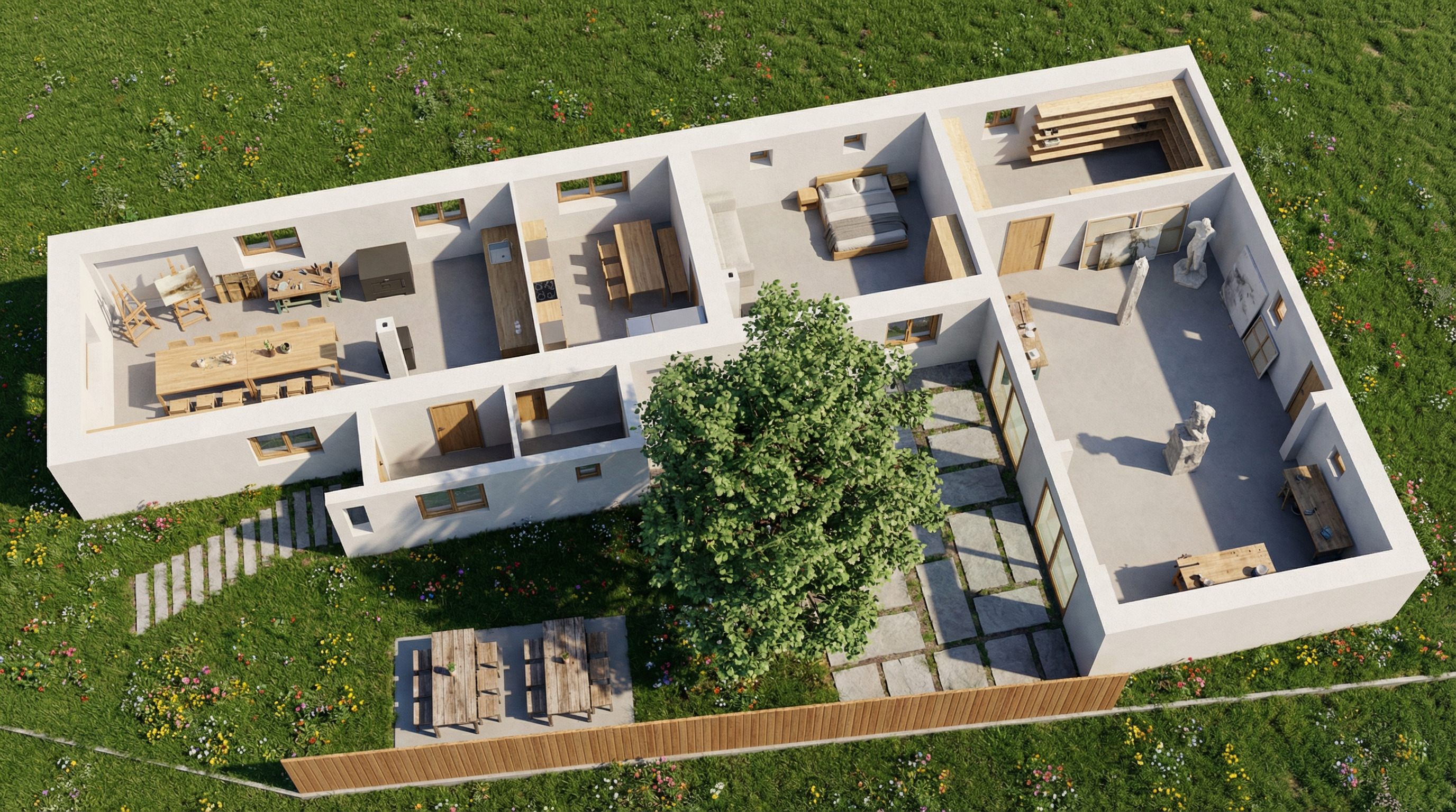 onle change the right room to artist atelier with two wooden colums and colour dirty floor