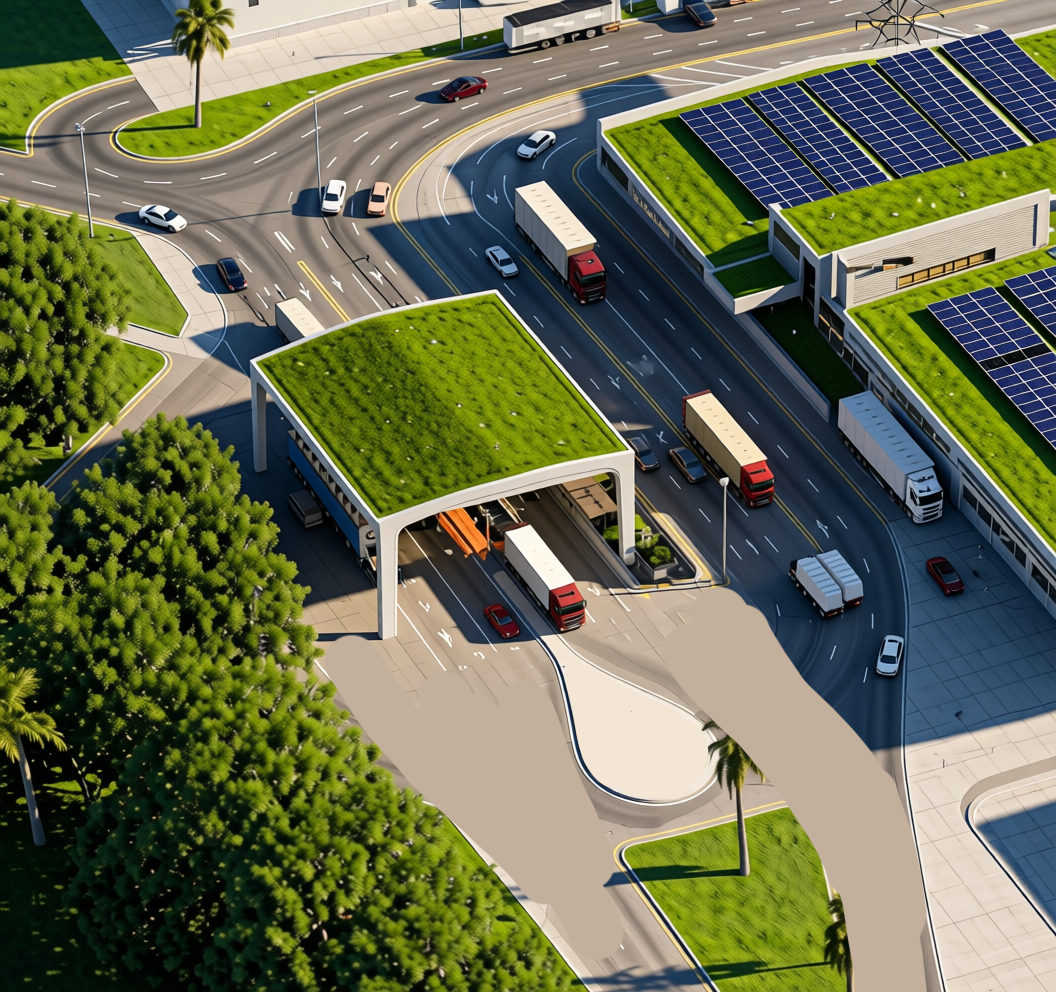 canopy structure weighing station with green roof on top four lanes of traffic with middle medium dividing lanes into 2 and 2 that connect straight on to road outside trucks coming out and in to station with tear drop medium in front of station connecting to divider in station