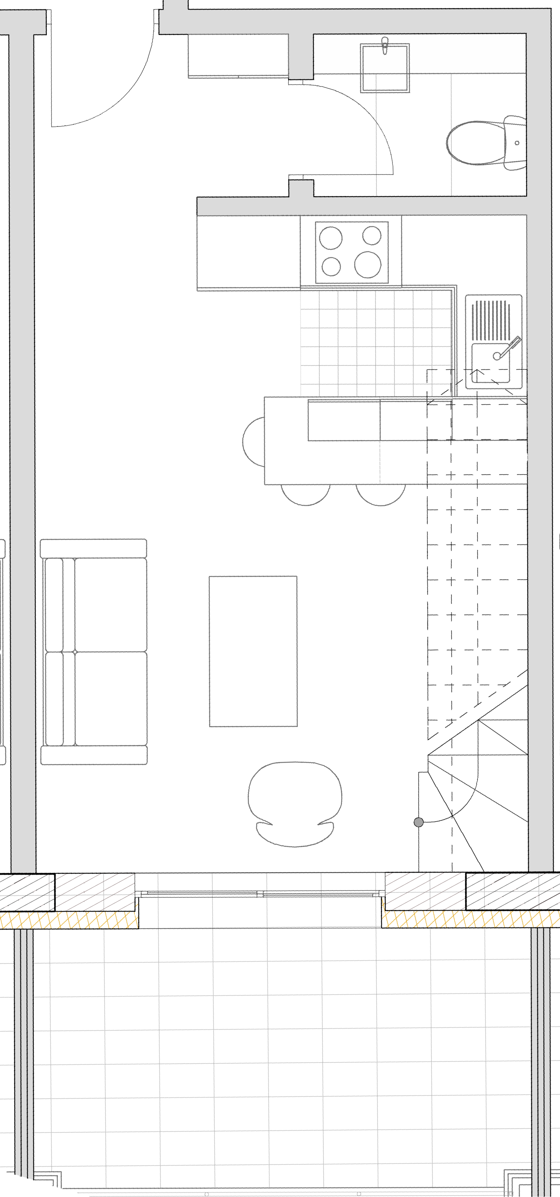 convert this floor plan into a realistic isometric 3d view of a full house show the space from an elevated angle with furniture walls and details visible create a detailed isometric architectural illustration of a compact loft apartment floor plan the space includes an open plan living and kitchen area with an l shaped kitchen counter a 4 burner hob sink and overhead cabinets a small dining table with 4 panton style white chairs a sofa with a coffee table and armchair a white floating staircase that rises diagonally upward from the ground floor level and stops mid air before reaching the upper loft level clearly showing vertical ascent with open risers and no wall enclosure the staircase is visually open lightweight and modern with a thin white metal structure and no handrail cladding a bathroom with toilet and sink style modern minimalist scandinavian warm neutral palette off white walls light beige microcement flooring natural oak wood accents and vertical timber slat wall panels include indoor plants placed beneath the staircase render as a clean isometric cutaway view from a 45 degree angle soft natural daylight no heavy shadows high architectural detail use the same furniture as shows on the plan do not change the orientation of the floorplan