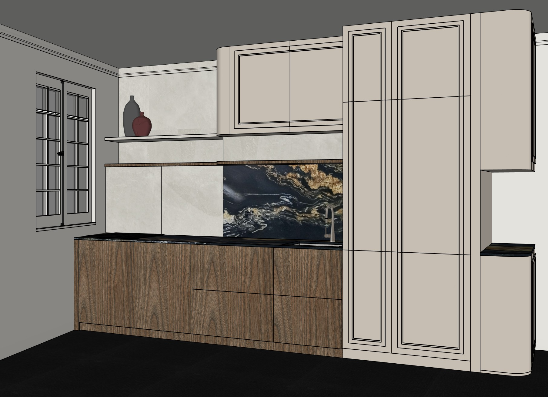 the appartment is on the 6th floor in a parisian building the wallabove the shelf is lightly plastered the floor is in very dark wooden floor there are no furniture buttons there is a double door beneath the wooden shelf on the left which is lightly plastered in light greige the frame of the window is the same color as the walls the espagnolette bolt on the window is in dark bronze the upper cabinets and the columns are in the same greige color the wall with the window and ceiling are in the same light greige as the upper cabinets all the lower cabinets are in elm style like colin king