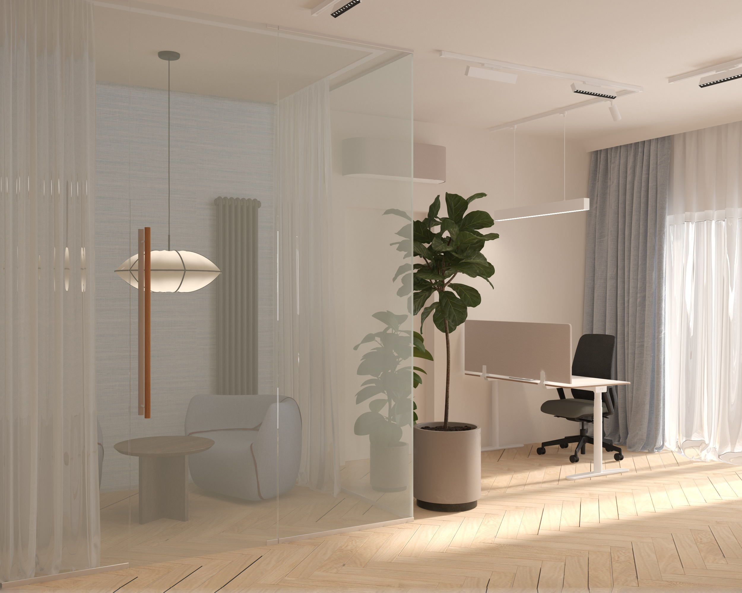 transform this 3d view into a high end photorealistic architectural render add a little natural sunlight entering from the window on the right side of the camera creating soft shadows and realistic light bounce but keep the whole image light and not too warm office vibe with a little domestic atmosphere outside there is a terrace with garden add the view but make it light and blurry the curtains should be natural linen fabric semi transparent warm white and heavier ones in low saturation light jeans color the chair behind the desk have a backrest made of semi transparent net the acoustic panel on the desk is beige fabric on the left there is a glass cubical the walls in the cubicle are light blue low saturation wallpaper with a little horizontal stripes overall look of a fabric the armchairs are also light blue color low saturation with bordeaux detail inside the cubical on the right side behind the armchair there is a vertical radiator zehnder charleston steel finish the curtains inside the cubicle shoud be semi transparent linnen natural look warm white to light beige color the ceiling both with the walls should be light beige color enhance material detail realistic reflections global illumination and natural color balance keep the original geometry and camera angle unchanged