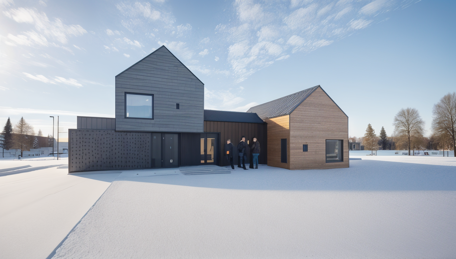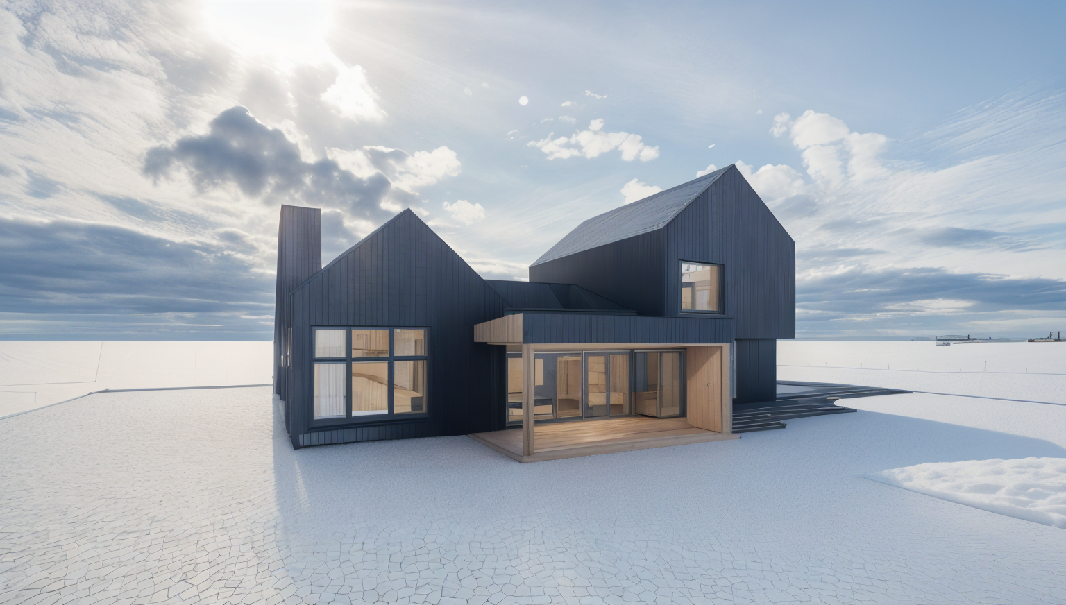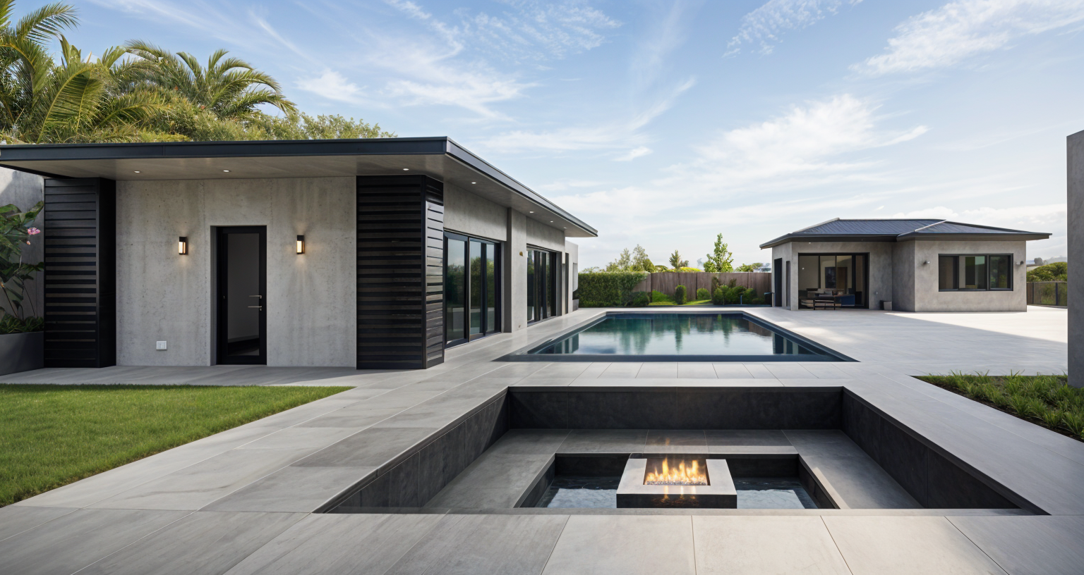 modern exterior shot modern exterior shot modern exterior shot black and concrete buildings with black roofs and black fence in the background rectangular pool and fire pit in center lush tropical greenery in background grass and smooth porcelain floor architecture architecture