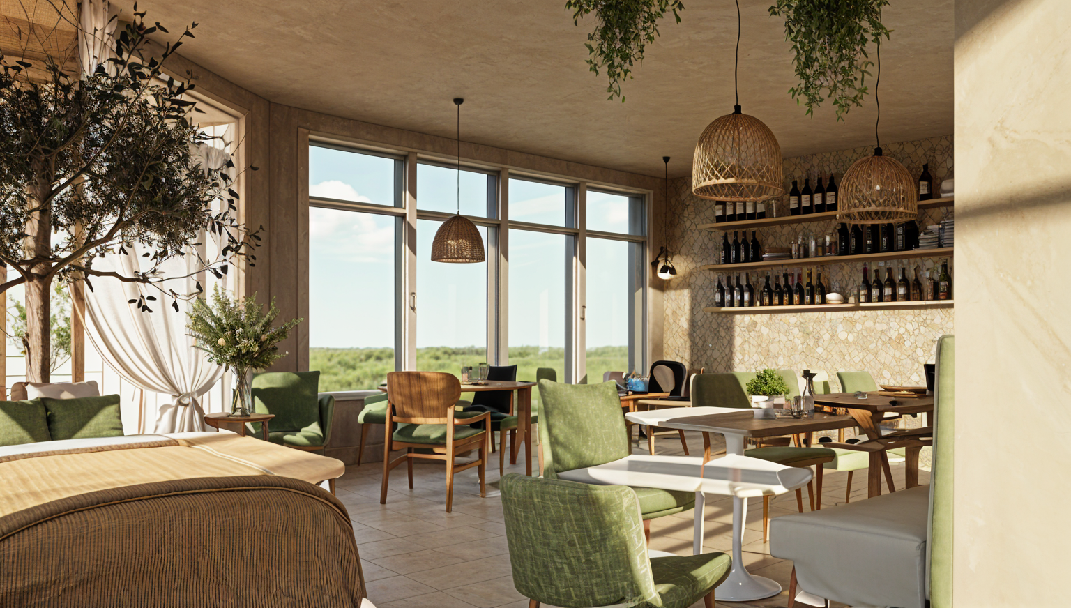 keep the same base geometry and layout do not change walls proportions or structure focus on the bar area make it more realistic warm and atmospheric add more plants especially hanging greenery falling from the ceiling place the olive tree inside a clay pot for a natural mediterranean look fill the shelves with bottles and glasses add small decorations and use soft warm lighting to create a cozy mood do not redesign or move anything only refine the bar area with more realistic materials lighting and mediterranean plants