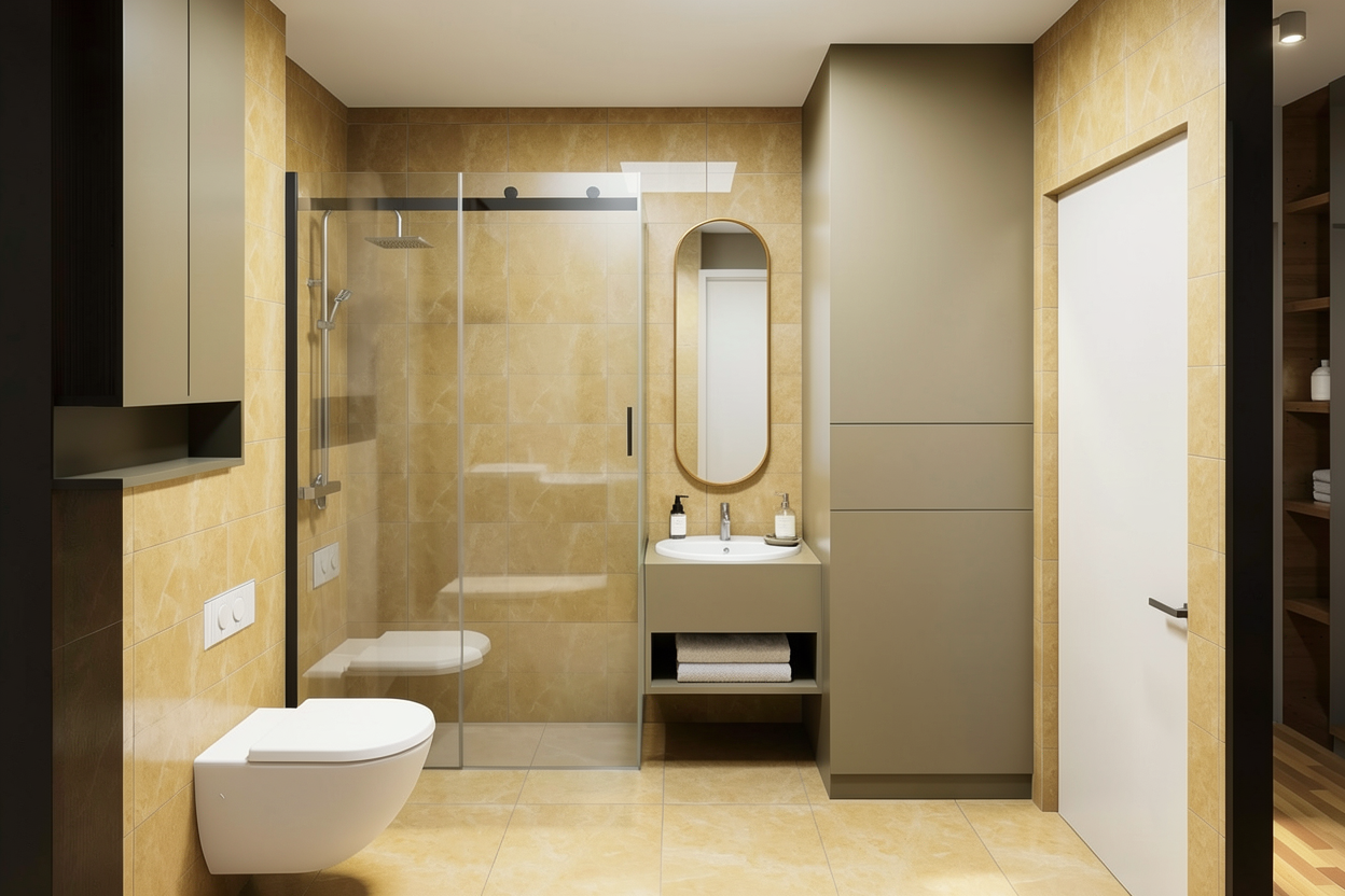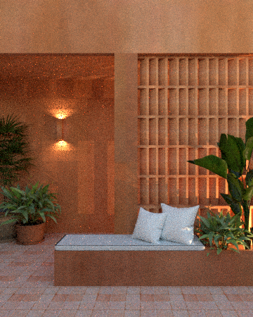 hyper realistic mediterranean outdoor corner at dusk built in bench with a solid base and light colored cushions background wall finished in warm terracotta toned textured plaster soft indirect lighting from a minimalist wall sconce creating warm ambient light and subtle shadows decorative terracotta lattice screen on the right side of the wall floor made of small natural terracotta tiles arranged in a grid pattern lush mediterranean plants in clay pots including broad tropical leaves and low greenery placed around the bench warm earthy color palette with clay sand and natural greens soft cinematic lighting high detail in textures realistic materials natural imperfections photorealistic quality preserve clean architectural lines and a calm intimate atmosphere