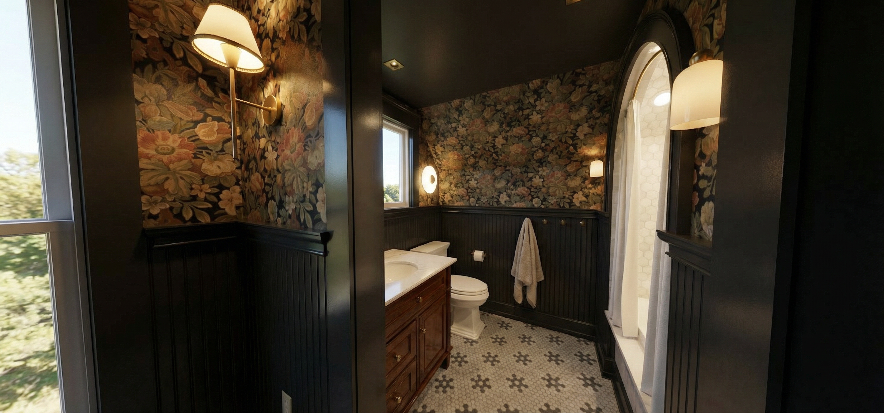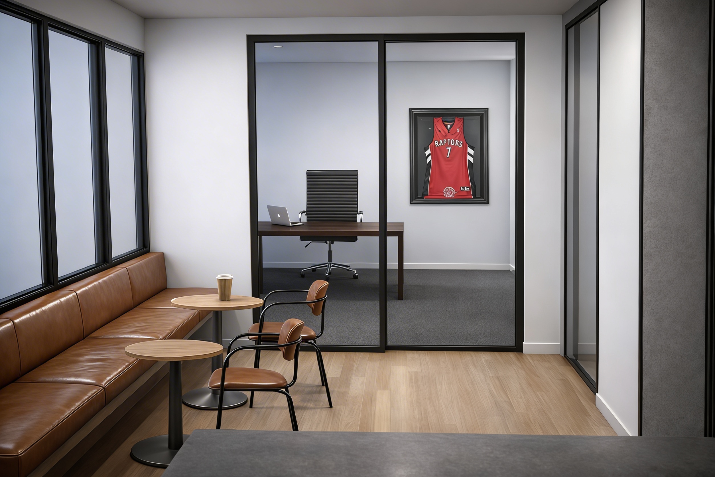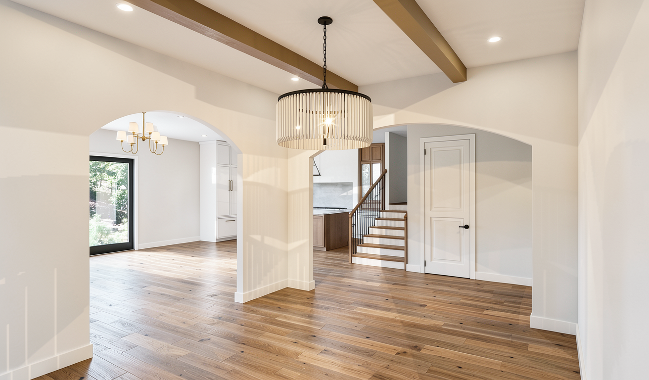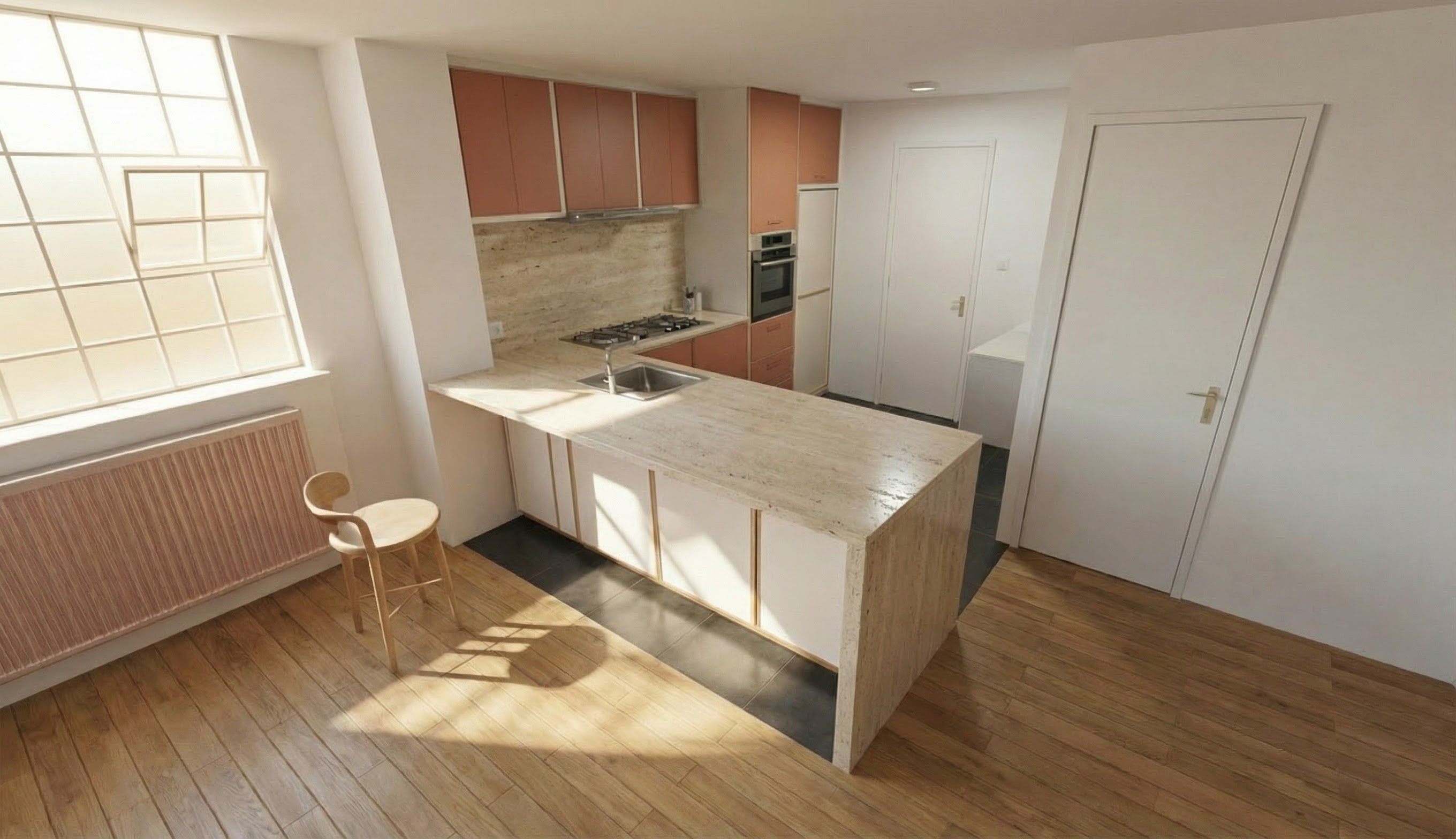 photorealistic interior kitchen render based on the provided image use the image as a strict geometric reference absolute lock do not modify walls ceilings cabinets countertops furniture windows or any other materials do not change colors textures or finishes of any element only adjust floor materials flooring keep the existing square ceramic tiles 30x30 cm dark grey black anthracite in the main kitchen area replace only the tiles directly under the countertop overhang with straight wood parquet matching the surrounding floor parquet orientation aligned with the glass brick direction natural wood tone matte finish realistic grain and joints rendering natural daylight soft global illumination balanced exposure photorealistic architectural visualization strict restrictions do not modify or replace any material besides the specified floor tiles do not touch furniture cabinets countertops walls or appliances