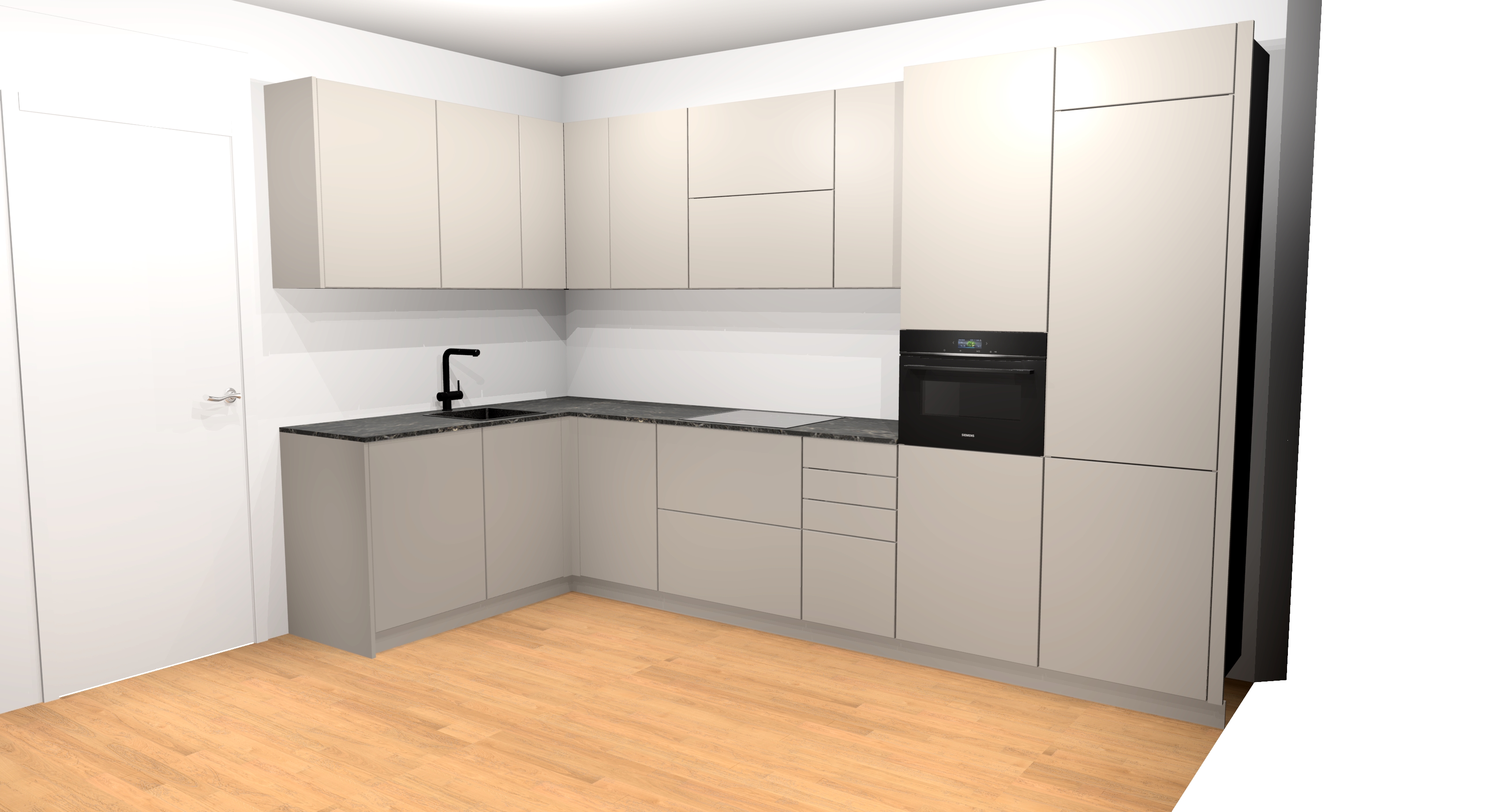 cocina moderna muebles en color cashmere mate encimera m rmol marr n sin subida las paredes azulejo piedra beige texturizado mate puerta de paso en madera de roble natural a ade decoraci n de cocina