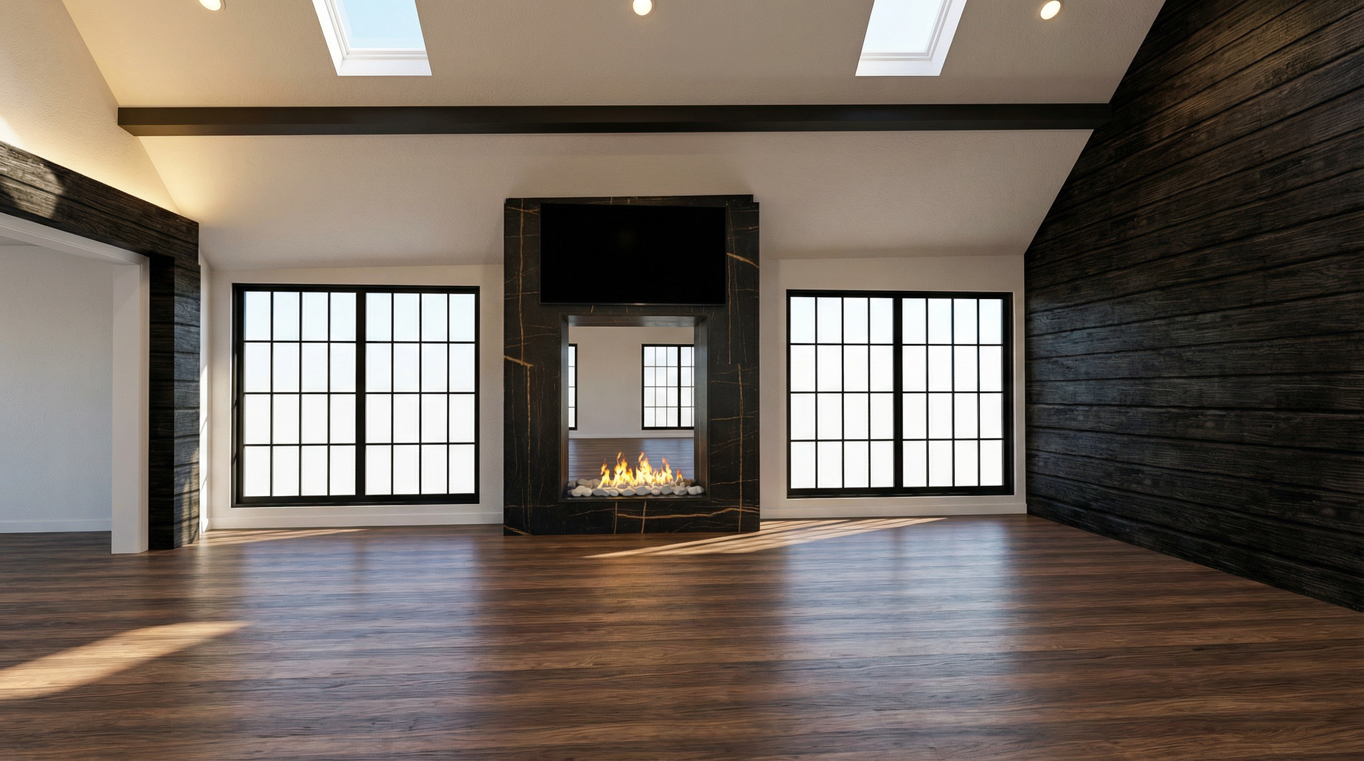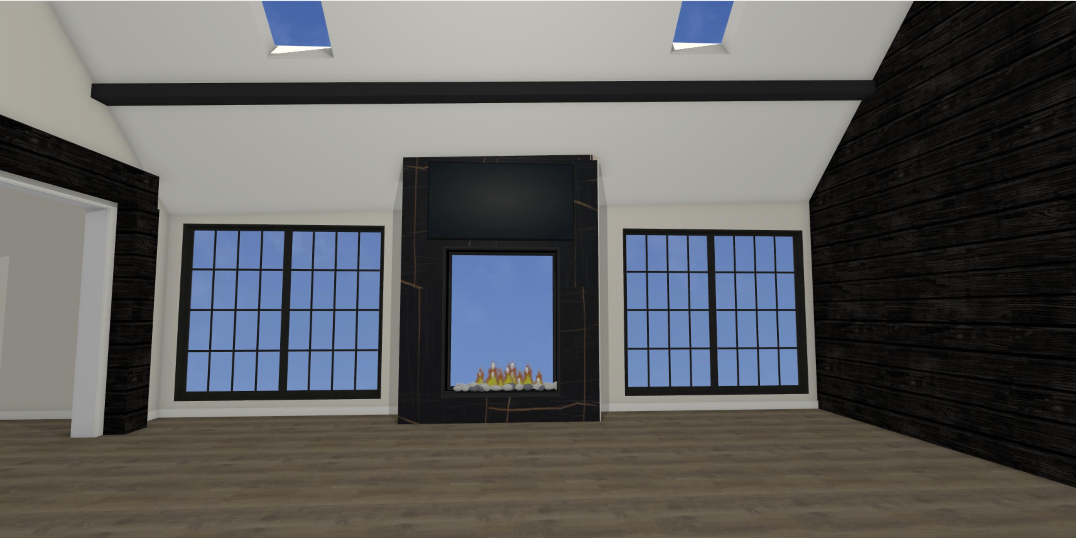 fireplace is doublesided with glass so you should be abe to see outside outside is a backyard with fence and a pool make outside blurred remove al furniture